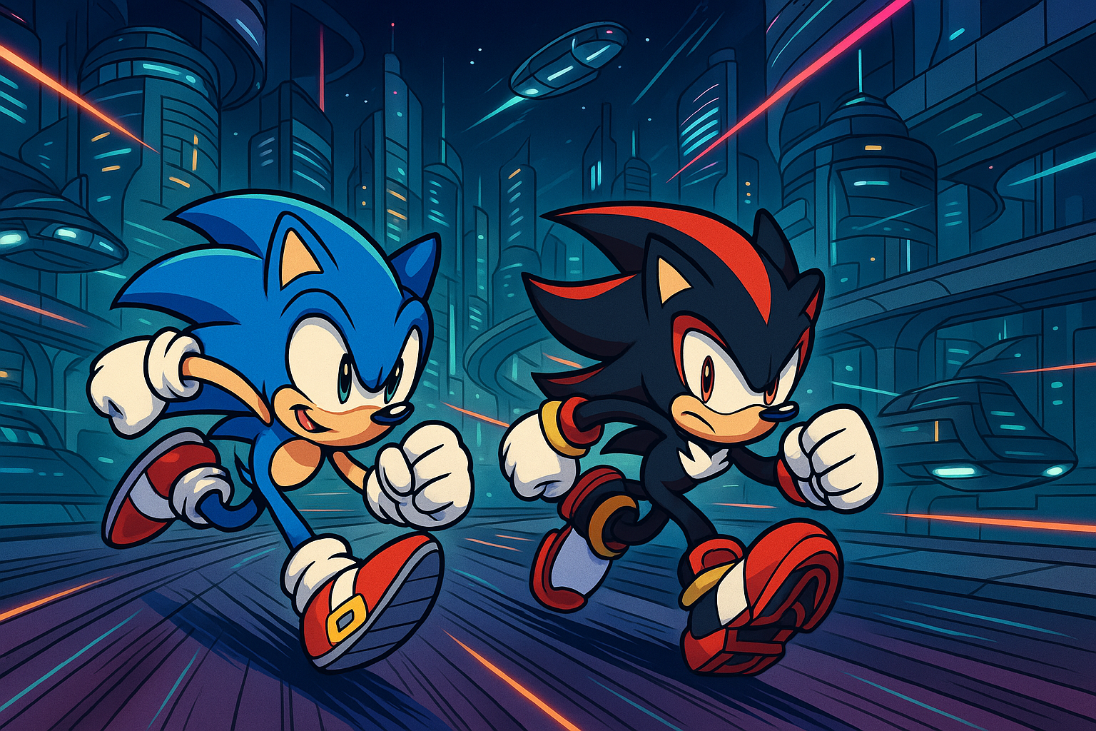 Diese Videospiel-Tapete fängt eine elektrisierende Szene aus dem geliebten Sonic-Universum ein, die vor einer futuristischen Stadtkulisse spielt. Die dynamische Komposition zeigt Sonic the Hedgehog in seinem charakteristischen Blau neben Shadow in auffälligem Schwarz und Rot, beide in actiongeladenen Posen. Der Hintergrund präsentiert ein Cyberpunk-Stadt-Design mit hoch aufragenden Wolkenkratzern, fliegenden Fahrzeugen und Neonlichtern, die eine Atmosphäre voller energiegeladener Abenteuer schaffen.