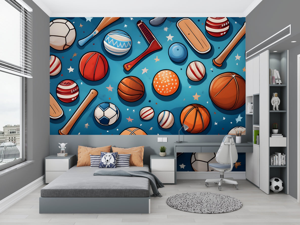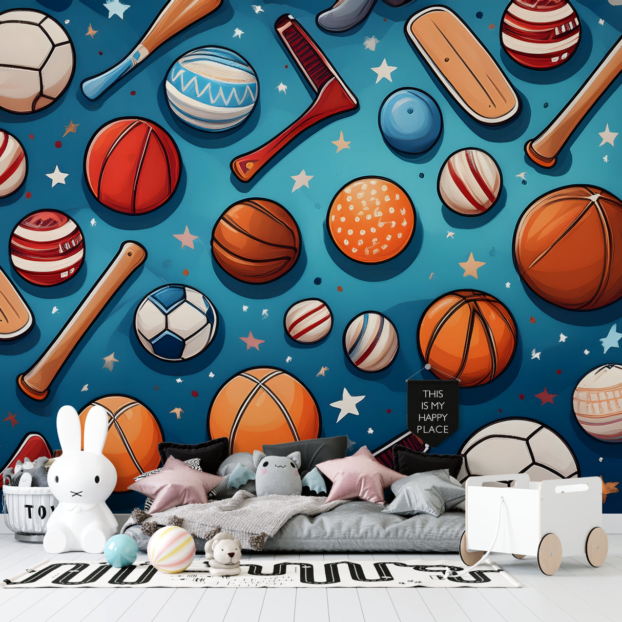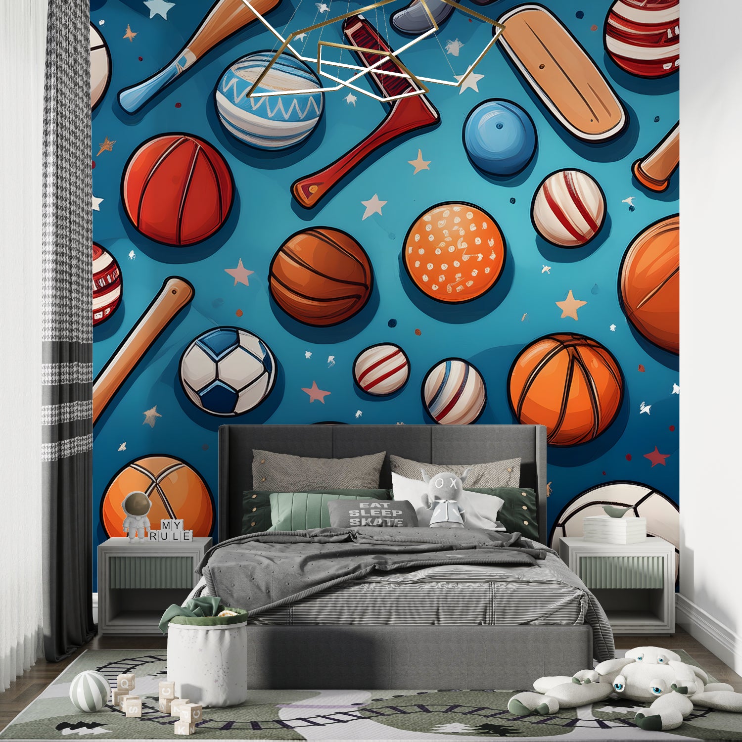 Diese lebendige Sport-Themen-Tapete zeigt eine verspielte Sammlung von Sportgeräten vor einem tiefen türkisfarbenen Hintergrund. Basketball-, Fußballbälle und Baseballschläger schweben zwischen funkelnden Sternen und schaffen ein dynamisches Muster, das den Geist des sportlichen Abenteuers einfängt. Das Sport-Wandbild verfügt über eine sorgfältig ausgewählte Farbpalette aus Orange, Rot, Blau und Weiß, wobei jedes Element in einem charmanten Cartoon-Stil dargestellt ist, der Tiefe und Charakter verleiht.