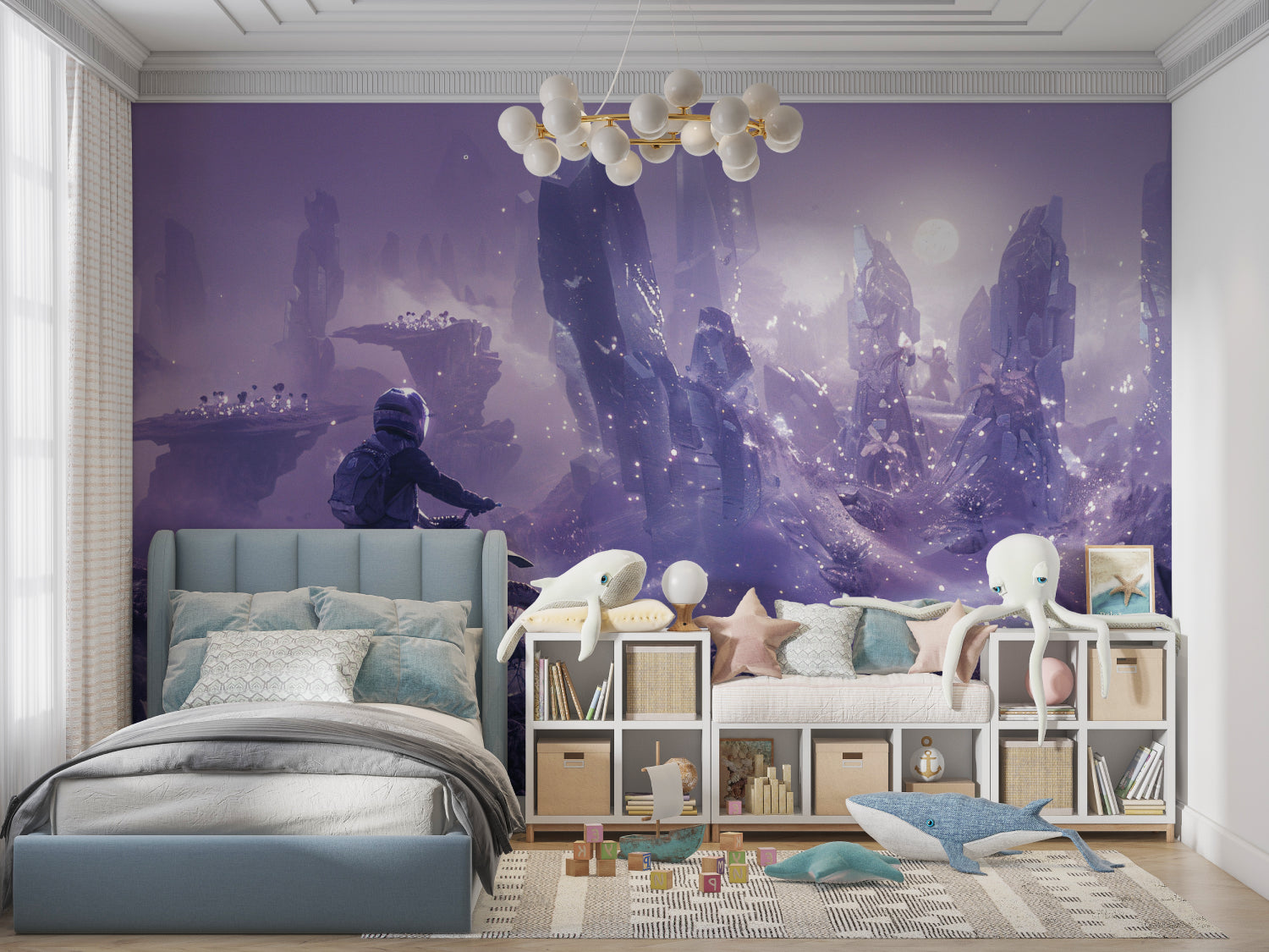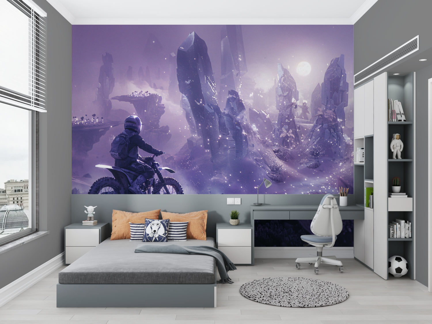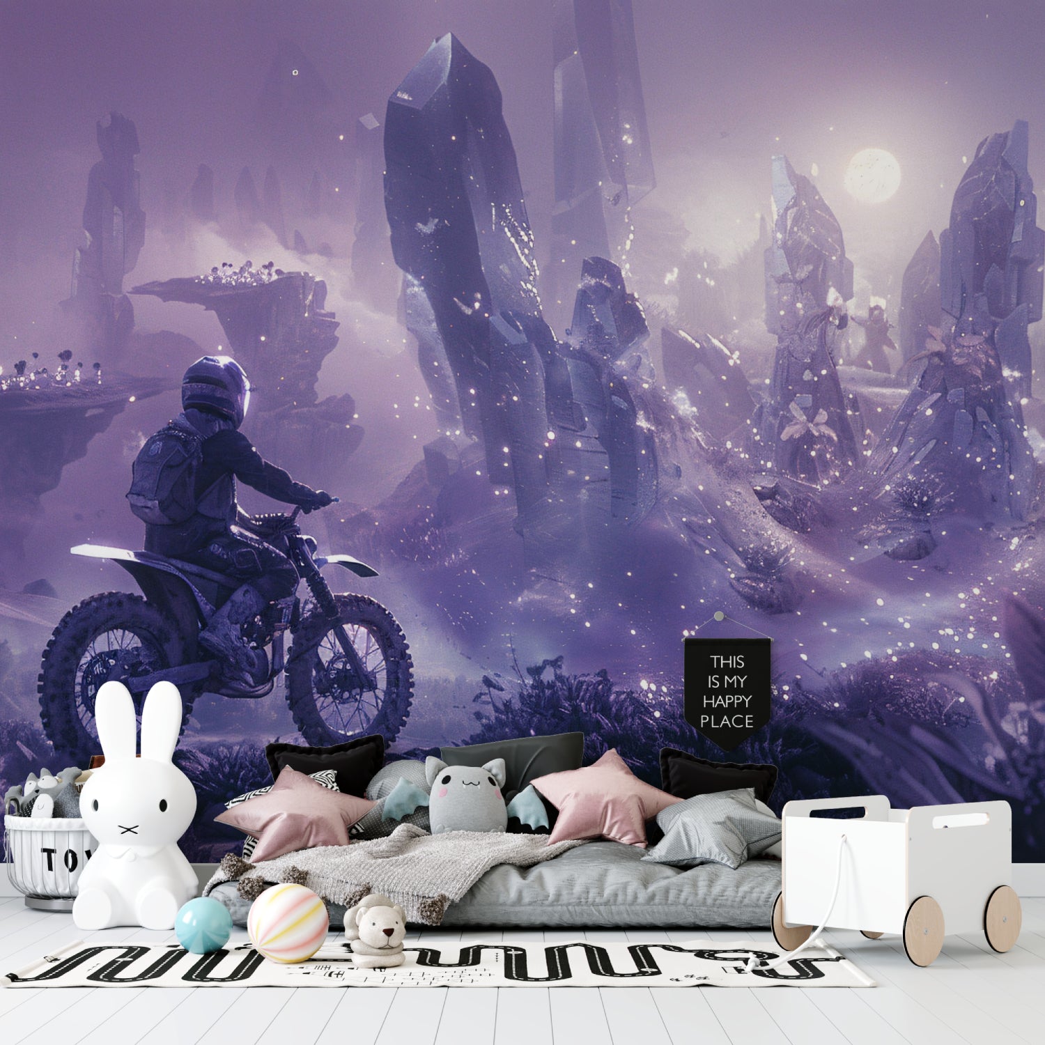 Dieses Motorrad-Tapeten-Mural versetzt Betrachter in eine faszinierende, violett getönte Traumlandschaft, in der Abenteuer auf Fantasie treffen. Vor dem Hintergrund hoch aufragender kristalliner Formationen, die den nebligen Horizont durchstoßen, begibt sich ein einsamer Motorradfahrer auf eine epische Reise durch dieses andereweltliche Terrain. Die violette Galaxie-Tapete zeigt schwebende Inseln, funkelnde Partikel und einen leuchtenden Mond, der die Szene in ätherisches Licht taucht und eine fesselnde Mischung aus surrealen Elementen und dynamischer Bewegung schafft.