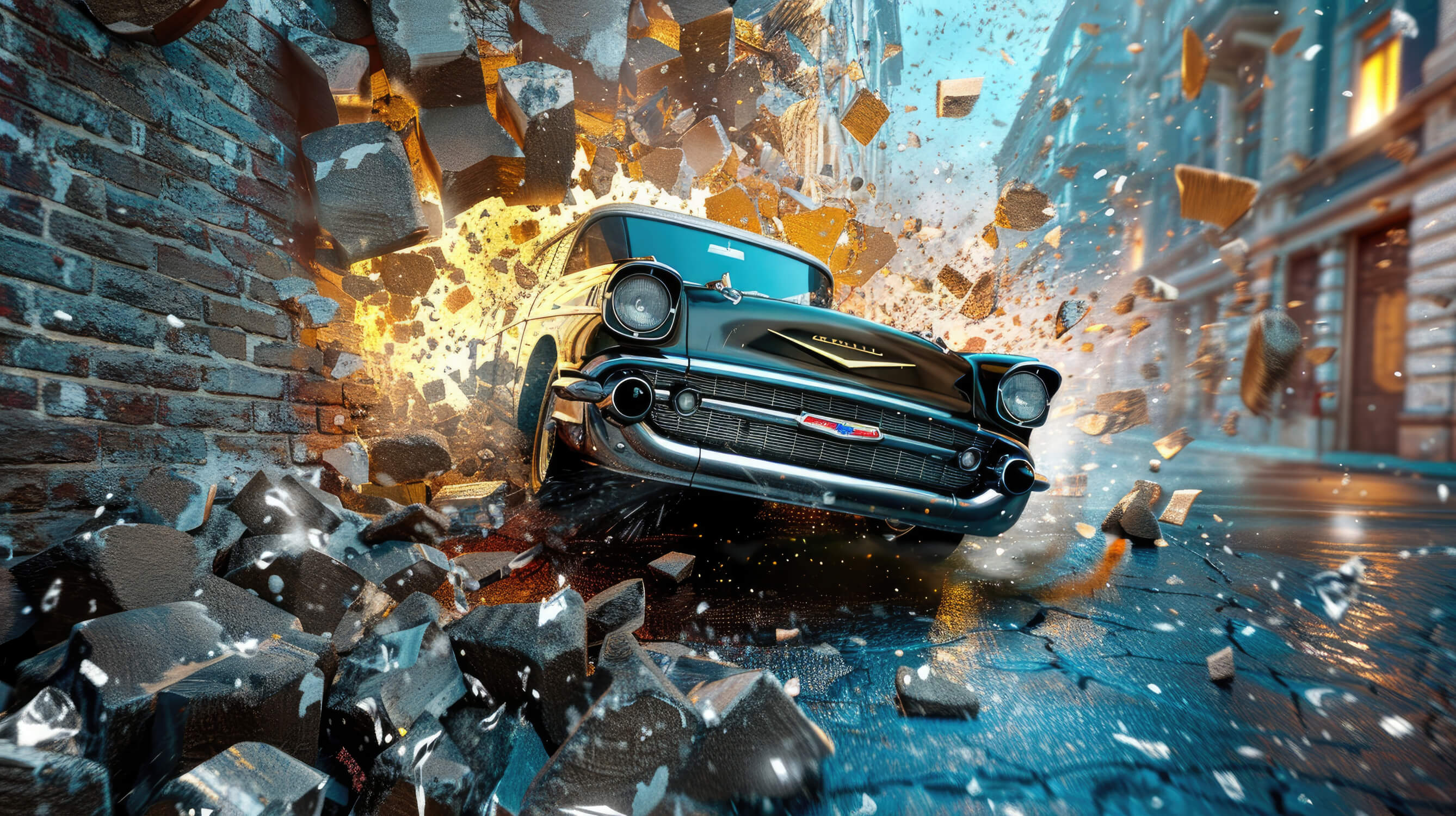 Diese Vintage-Auto-Tapete zeigt eine dramatische Szene, in der ein klassischer Chevrolet durch eine Ziegelwand bricht und eine explosive Darstellung von Kraft und Bewegung bietet. Vor einem dynamischen Hintergrund aus türkis- und bernsteinfarbenen Tönen schafft die 3D-Auto-Tapete eine Tiefenillusion mit verstreutem Schutt und goldenen Fragmenten, die in der Luft eingefroren sind. Das sorgfältig detaillierte Vintage-Auto steht im Mittelpunkt, seine Chromdetails und das ikonische Design fangen die Essenz retroautomobiler Exzellenz ein.
