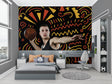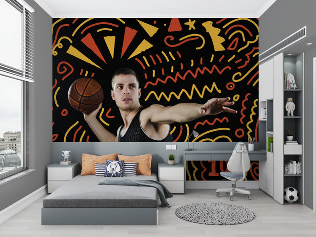 Dieses Sport-Tapeten-Mural zeigt ein dynamisches Basketball-Thema vor einem auffälligen schwarzen Hintergrund, der mit energiegeladenen gelben und orangefarbenen geometrischen Mustern verziert ist. Das lebendige Design umfasst geschwungene Linien, verspielte Zickzackmuster und strahlende Sonnenstrahlen, die eine Atmosphäre von Bewegung und Aufregung schaffen. Die basketballbezogene Tapete kombiniert moderne grafische Elemente mit sportlichen Bildern und ergibt eine kühne und zeitgemäße visuelle Aussage.