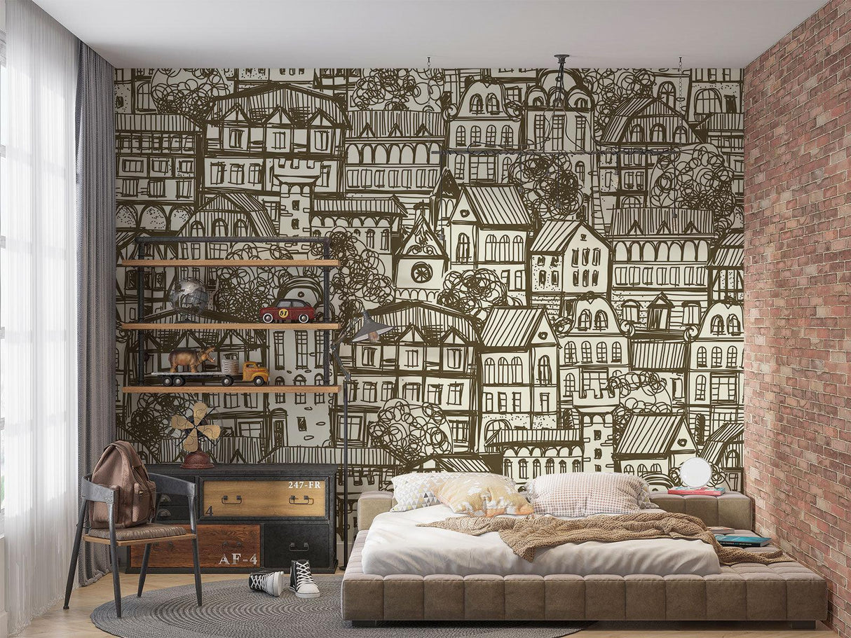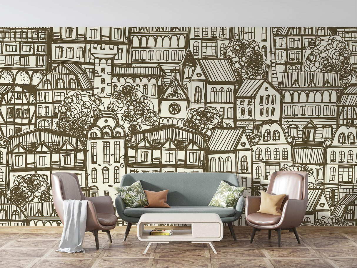 Diese urban sketch wallpaper zeigt eine bezaubernde Stadtlandschaft in raffinierten Braun- und Cremetönen und präsentiert ein detailliertes Panorama charmanten architektonischen Elemente. Der handgezeichnete Stil erzeugt ein faszinierendes Muster viktorianisch inspirierter Gebäude, Kirchtürme und blätterreicher Bäume, alles meisterhaft komponiert in einer vintage line art wallpaper, die das Wesen einer Märchenstadt einfängt.