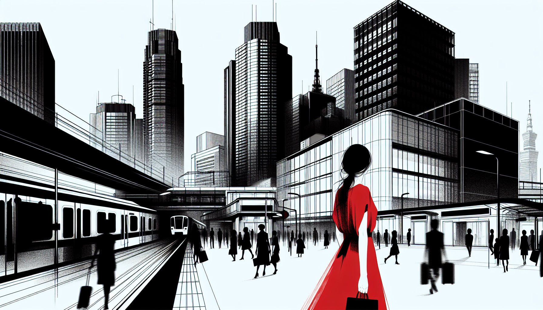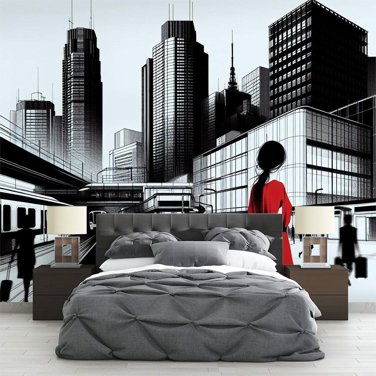 Diese urban cityscape wallpaper fängt das Wesen des städtischen Lebens durch eine auffällige monochrome Komposition ein, die von einem kräftigen roten Farbtupfer durchbrochen wird. Die dramatische Schwarz-Weiß-Darstellung von hoch aufragenden Wolkenkratzern, eleganten U-Bahn-Plattformen und moderner Architektur schafft ein anspruchsvolles urbanes Panorama. Die moderne Stadt Tapete verbindet meisterhaft scharfe geometrische Linien mit den fließenden Silhouetten der Stadtbewohner, während die einzelne rote Figur als künstlerischer Mittelpunkt dient.