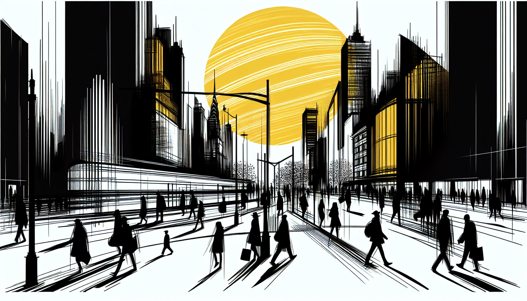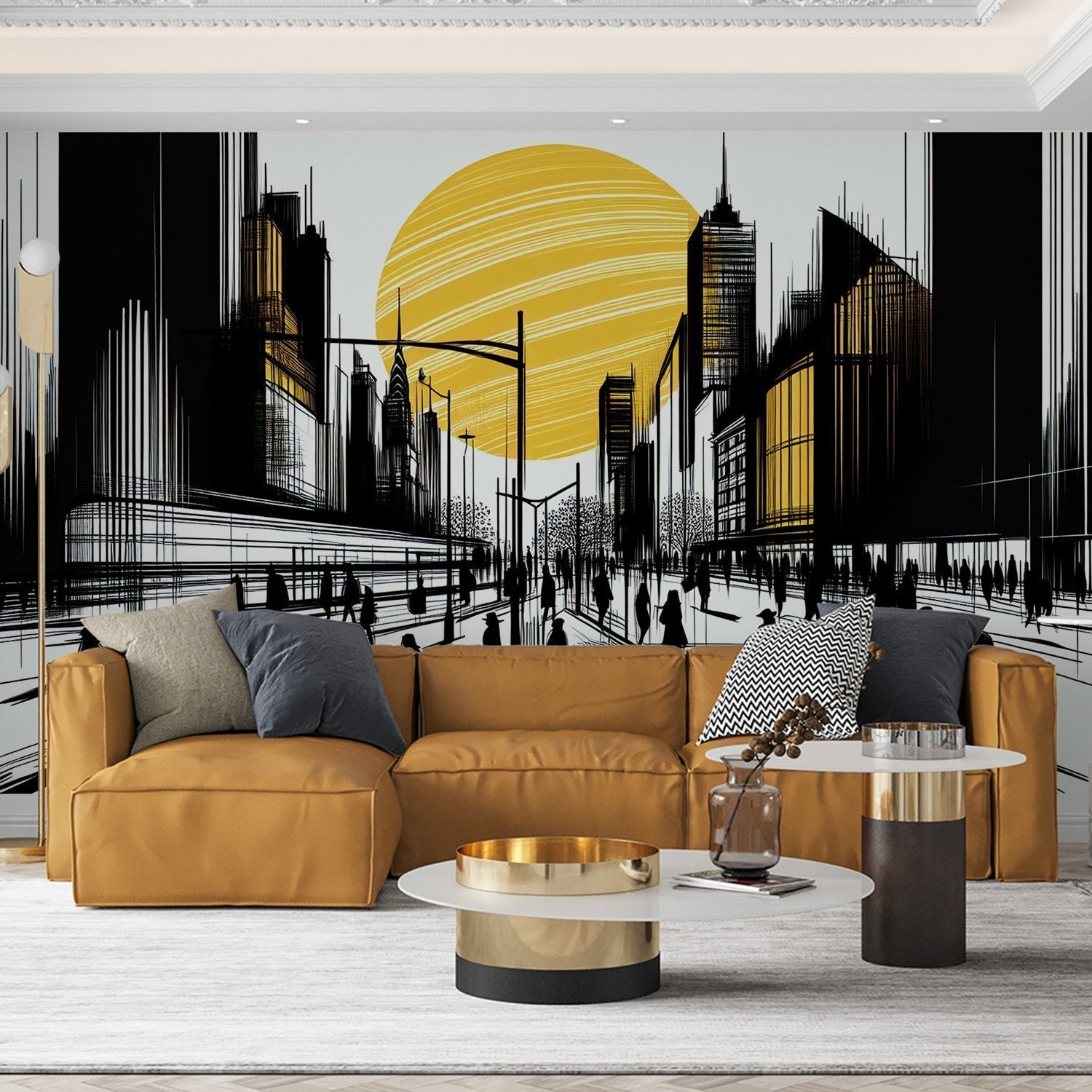 Diese urban skyline tapete fängt das Wesen des städtischen Lebens durch eine eindrucksvolle künstlerische Komposition ein. Der dramatische Kontrast von schwarzen Silhouetten vor einer strahlenden goldenen Sonne schafft eine fesselnde Stadtlandschaft, in der schlanke Wolkenkratzer den Himmel durchbohren, während schattenhafte Figuren durch die belebten Straßen unten ziehen. Die moderne stadt tapete kombiniert kühne geometrische Linien mit einer raffinierten Farbpalette aus Schwarz und Gold und schafft eine Atmosphäre urbaner Energie und künstlerischer Raffinesse.