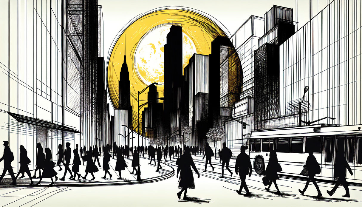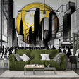 Diese auffällige urban skyline tapete fängt das Wesen des städtischen Lebens durch eine meisterhafte Mischung aus schwarz-weißer Linienkunst vor einem dramatischen goldenen Mond ein. Die ikonischen Wolkenkratzer erheben sich majestätisch vor dem leuchtenden kreisförmigen Hintergrund, während detaillierte architektonische Elemente und Straßenszenen Tiefe und Bewegung schaffen. Das stadt wandbild zeigt einen harmonischen Kontrast zwischen scharfen geometrischen Formen und dem organischen Glühen des himmlischen Elements.
