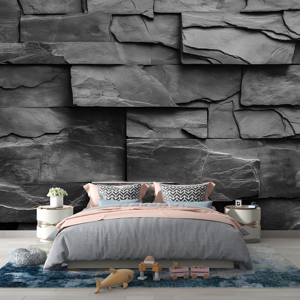 Diese 3D-Stein-Tapete zeigt die rohe Schönheit von geschichtetem Schiefer in dramatischem Detail. Jede Schicht aus schwarzem und kohlefarbenem Stein erzeugt einen auffälligen dreidimensionalen Effekt, mit natürlichen Spalten und Texturen, die Licht und Schatten einfangen. Das moderne Steinwandbild zeigt eine authentische Anordnung von grob behauenen Blöcken und präsentiert ein raffiniertes Zusammenspiel von Tiefen und Winkeln, das architektonisches Drama in jeden Raum bringt.