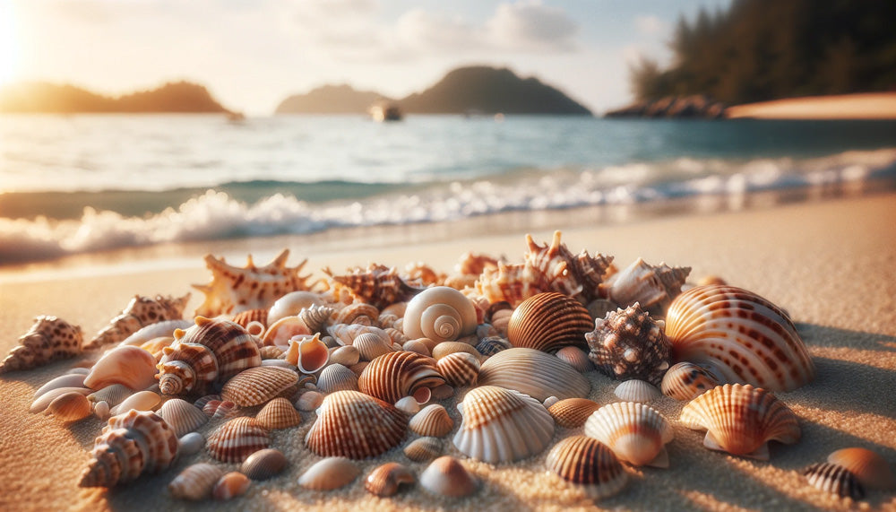 Diese Strandfotografie-Tapete fängt eine faszinierende Küstenszene ein, in der goldene Muscheln auf sonnenverwöhntem Sand ruhen. Die Komposition zeigt eine Reihe kunstvoll gemusterter Muscheln in warmen Bernstein- und Elfenbeintönen, vor einem Hintergrund aus türkisfarbenem Wasser und bergigen Silhouetten. Die Meereslandschafts-Tapete badet im sanften Schein des Sonnenuntergangs und schafft eine harmonische Mischung aus natürlichen Farben und Texturen, die Geschichten von Ozeanschätzen erzählen.