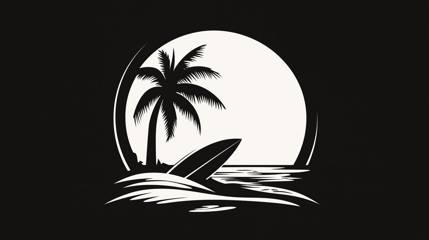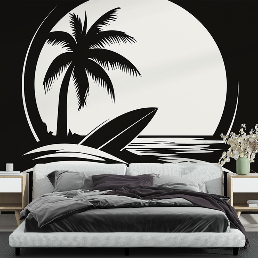 Diese minimalistische Strandtapete fängt die Essenz der Küstenruhe durch eine eindrucksvolle Schwarz-Weiß-Komposition ein. Eine majestätische Palmensilhouette steht vor einem leuchtenden kreisförmigen Hintergrund, während Surfbretter friedlich am Ufer ruhen und ein modernes Strandwandbild schaffen, das von endlosen Sommertagen erzählt. Die klaren Linien und der starke Kontrast zeigen meisterhafte Kunstfertigkeit in der Einfachheit und bieten eine zeitgenössische Interpretation traditioneller Strandszenen.