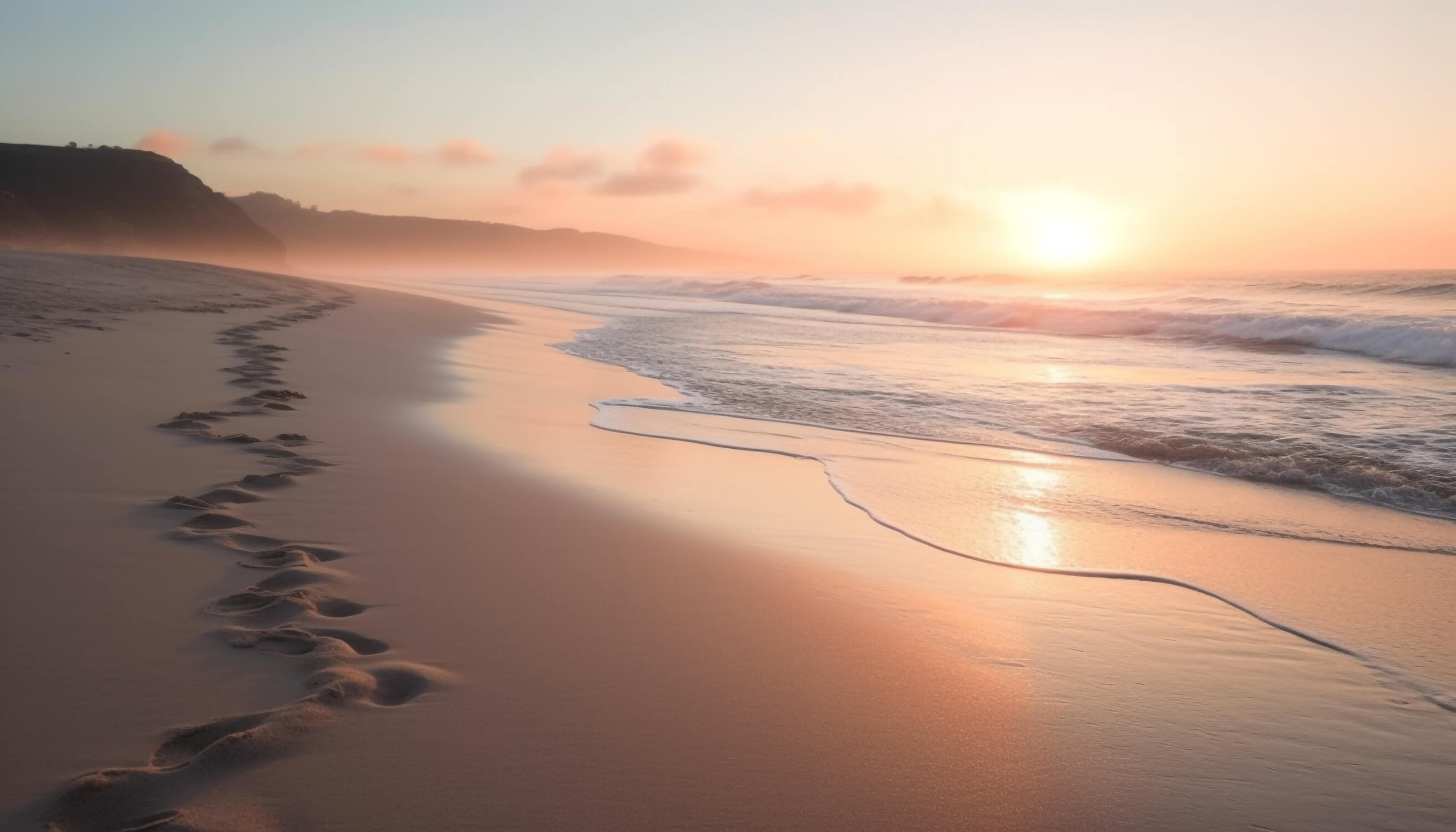 Diese küstennahe Strandtapete fängt die ätherische Schönheit einer sonnenuntergangsgeküssten Küste ein, wo sanfte Wellen auf goldenen Sand in perfekter Harmonie treffen. Die warmen Pfirsich- und Bernsteintöne verschmelzen nahtlos mit dem sanften Pastellhimmel, während neblige Berge in der Ferne Tiefe und Perspektive schaffen. Die Ozean-Sonnenuntergangs-Tapete zeigt den friedlichsten Moment der Natur, mit kristallklarem Wasser, das die letzten Strahlen des Tages reflektiert.