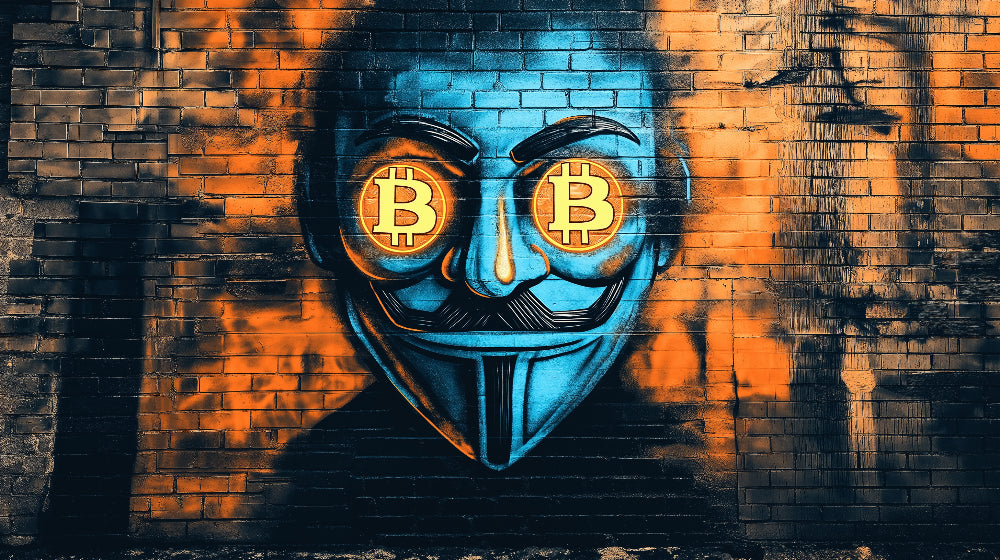 Diese urban street art tapete zeigt eine kraftvolle Verschmelzung von Kryptowährungskultur und Straßenästhetik. Die ikonische Maske, dargestellt in auffälligen Blautönen vor verwittertem Ziegel, zieht alle Blicke auf sich, während Bitcoin-Symbole als Augen in leuchtendem Gold glänzen. Die graffiti-stil tapete zeigt meisterhafte Spray-Techniken und schafft dramatische Kontraste zwischen kühlen Azurblau-Tönen und warmen Orangeschattierungen, die über die strukturierte Ziegeloberfläche zu tanzen scheinen.