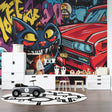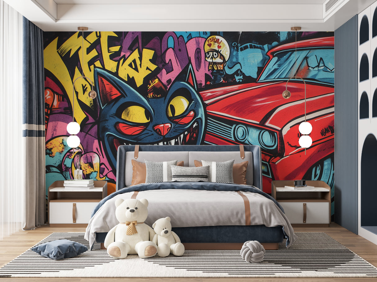Street Art Tapete | Urbaner Graffiti-Katze und klassisches Auto