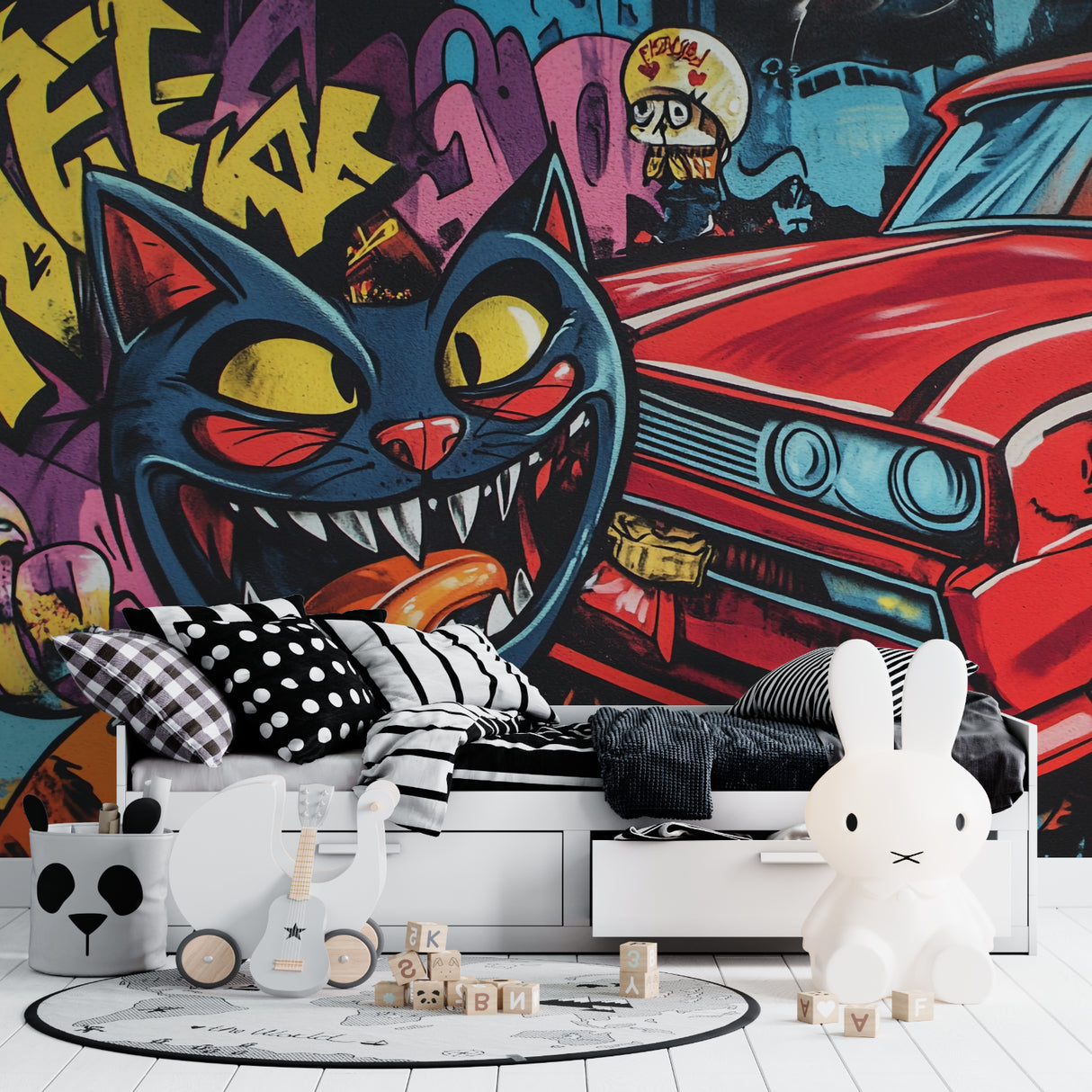 Die Mischung aus Graffiti-Elementen und der markanten Katze schafft ein unvergessliches urbanes Wanddesign.