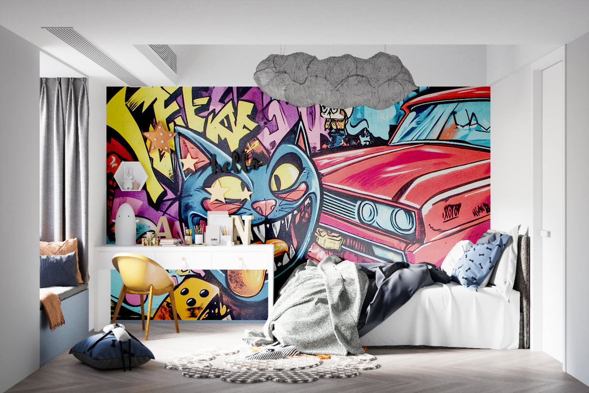 Diese Street-Art-Tapete zeigt ein lebendiges urbanes Meisterwerk mit einer auffälligen schwarzen Katze mit durchdringenden gelben Augen neben einem klassischen roten Auto. Die dynamische Komposition sprüht vor Energie durch kräftige Spritzer von gelben, pinken, violetten und türkisfarbenen Graffiti-Elementen. Das Graffiti-Wandbild verbindet die Authentizität der Straßenkultur mit künstlerischem Flair und schafft eine kraftvolle visuelle Aussage, die das Wesen der zeitgenössischen urbanen Kunst einfängt.