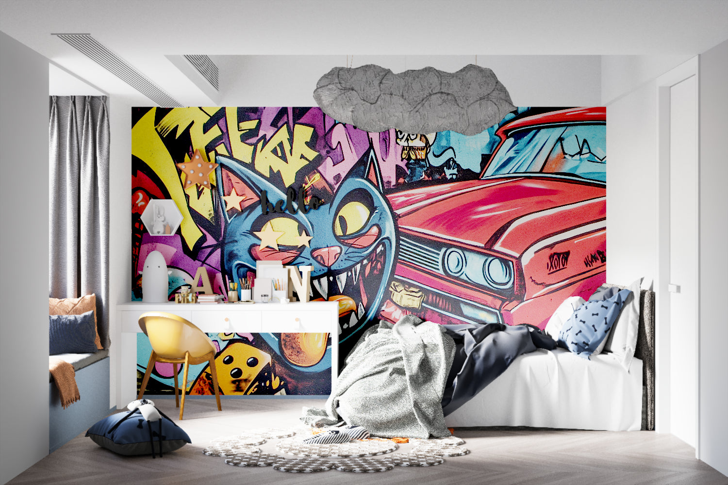 Verwandeln Sie jeden Raum in eine moderne urbane Galerie mit dieser urbanen Kunsttapete. Das kräftige Design eignet sich besonders für Jugendzimmer, kreative Räume oder Akzentwände in zeitgenössischen Innenräumen. Dieses Graffiti-Kunstwandbild verleiht Tiefe und Charakter und schafft eine Atmosphäre kreativer Energie und jugendlichen Geistes, perfekt für diejenigen, die mutige, expressive Designelemente in ihrem Wohnraum schätzen.