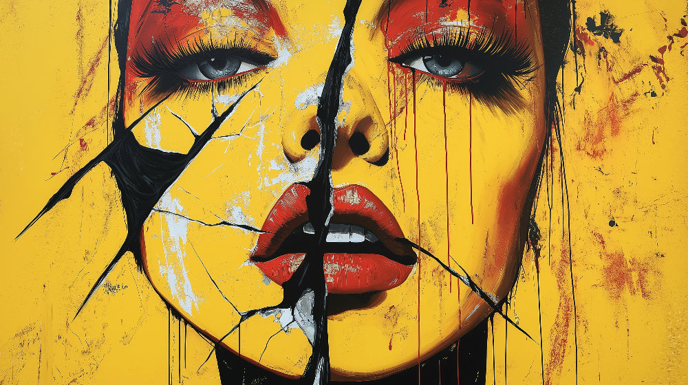 Diese Urban Art Tapete zeigt ein auffälliges Porträt, das in einem dramatischen Street-Art-Stil dargestellt ist. Vor einem lebendigen gelben Hintergrund zeigt die Komposition kräftige rote Lippen und durchdringende blaue Augen, die durch künstlerische schwarze Brüche zersplittert wirken und einen faszinierenden zersplitterten Glas-Effekt erzeugen. Das Graffiti-Stil Wandbild verbindet präzise Details mit rohen, tropfenden Elementen, die die Ästhetik der zeitgenössischen Street Art verkörpern.
