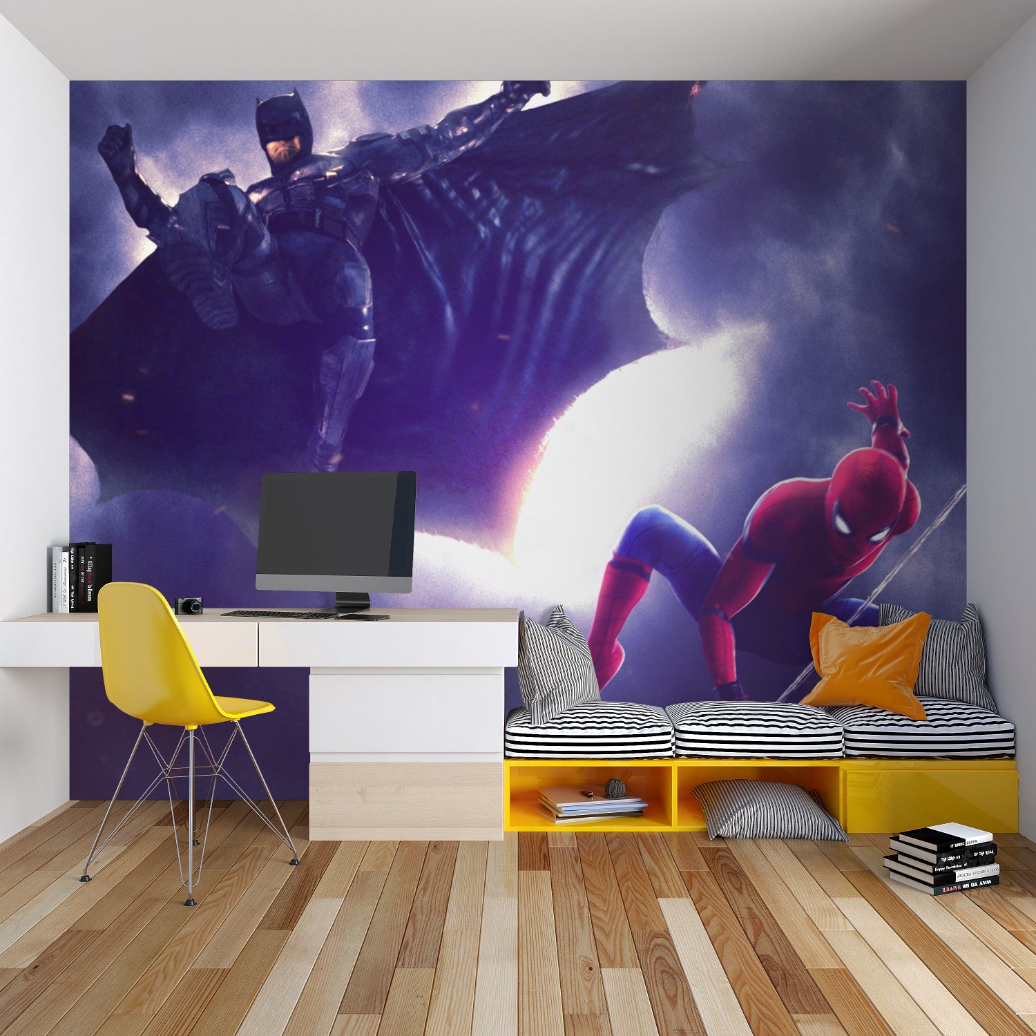 Verwandeln Sie jeden Raum in ein actiongeladenes Refugium mit diesem Batman- und Spiderman-Tapeten-Mural. Ob im Jugendzimmer, Spielzimmer oder modernen Wohnraum gestaltet, bietet diese Superhelden-Themen-Tapete sowohl dramatische Wirkung als auch künstlerische Raffinesse. Das Design schafft eine immersive Atmosphäre, die Comic-Enthusiasten anspricht und gleichzeitig eine gehobene Ästhetik für zeitgenössische Inneneinrichtung bewahrt.