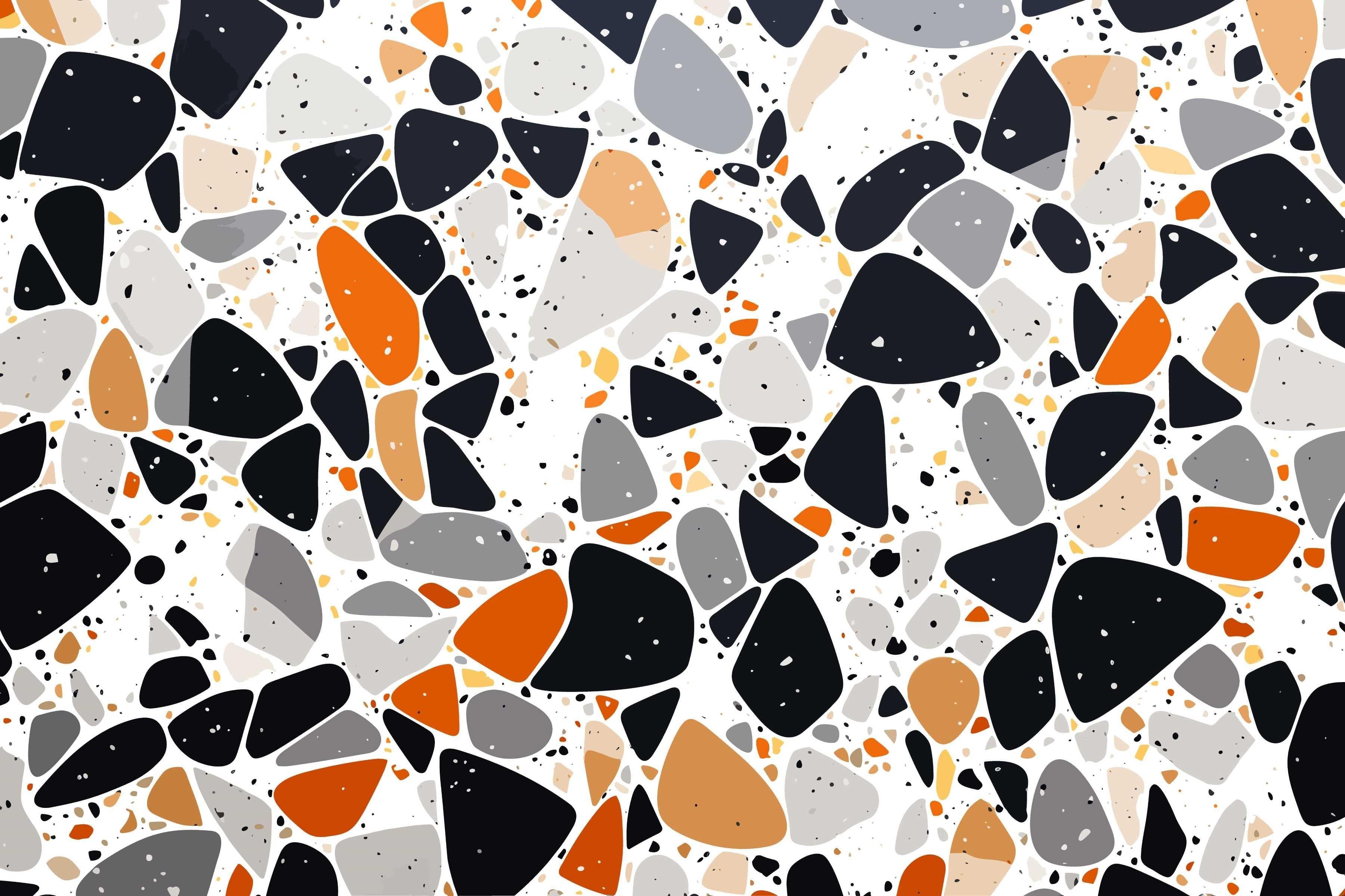 Diese Terrazzo-Tapete zeigt eine auffällige Komposition organischer Formen in einer anspruchsvollen Palette aus Kohlegrau, Hellgrau und lebendigem Orange vor einem klaren weißen Hintergrund. Das dynamische moderne Terrazzo-Wandbild erzeugt einen fesselnden visuellen Rhythmus durch seine verstreuten geometrischen Fragmente, wobei jedes Stück sorgfältig positioniert ist, um ein perfektes Gleichgewicht zwischen kräftigen und subtilen Elementen zu erreichen.