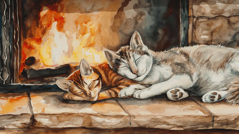 Tapete mit Haustier-Motiv | Aquarell-Katzen am Kamin