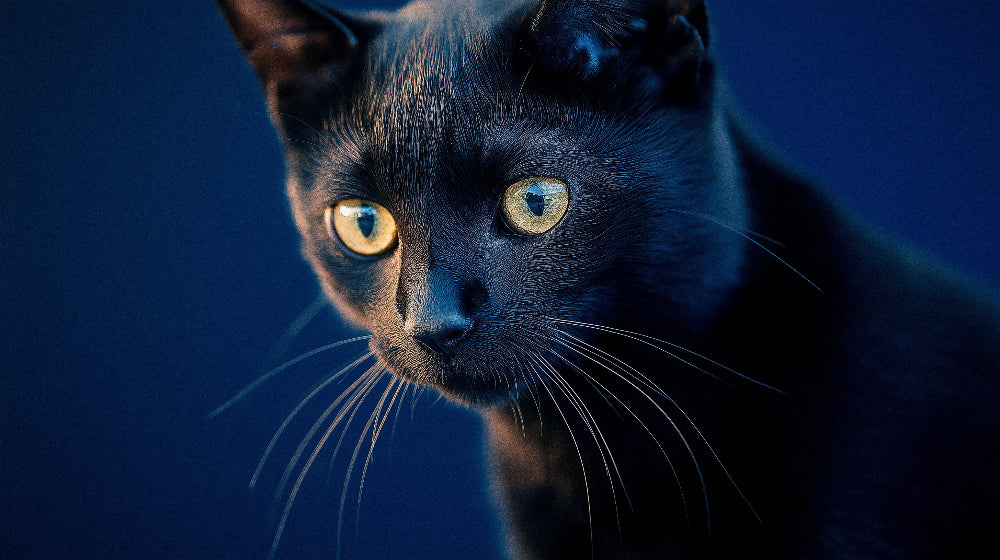 Dieses fesselnde Tapetenwandbild mit schwarzer Katze zeigt ein intimes Porträt, in dem Kunst auf Natur trifft. Der auffällige Kontrast zwischen dem mitternachtsschwarzen Fell und den leuchtend goldenen Augen schafft einen faszinierenden Blickfang, während der tiefblaue Hintergrund Tiefe und Geheimnis verleiht. Jede zarte Schnurrhaar und subtile Fellstruktur ist in außergewöhnlichen Details dargestellt, was dieses Katze-Porträt-Tapetenbild zu einem Meisterwerk der fotografischen Kunst macht.