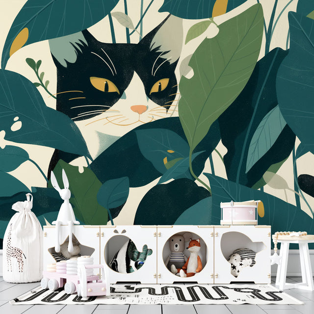 Verwandeln Sie Ihren Raum mit dieser botanischen Katzen-Tapete, die die perfekte Balance zwischen Verspieltheit und Raffinesse bringt. Das tropische Blätter-Design erzeugt Tiefe und Bewegung, während das ausdrucksstarke Gesicht der Katze Persönlichkeit und Charme hinzufügt. Diese vielseitige Wandmalerei passt sich wunderschön an verschiedene Umgebungen an, von einer gemütlichen Leseecke bis zu einem modernen Wohnraum, und bietet eine einzigartige Verschmelzung von Natur und Kunst, die die Fantasie fesselt.