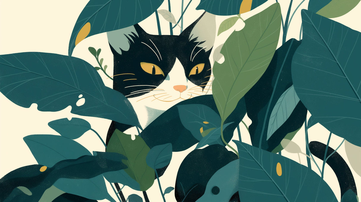 Die Mischung aus goldenäugiger Katze und üppigen tropischen Blättern schafft Tiefe und Geheimnis.