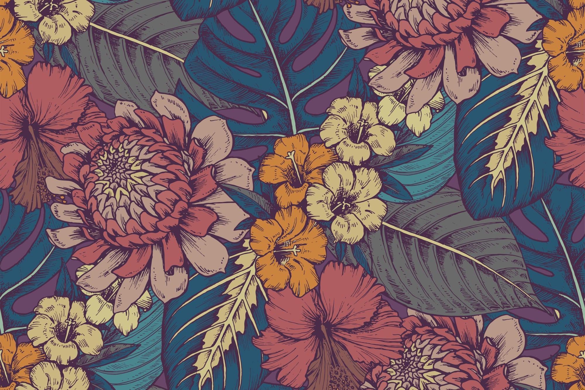 Tropische Blumen Tapete | Vintage Hibiskus- und Monstera-Design