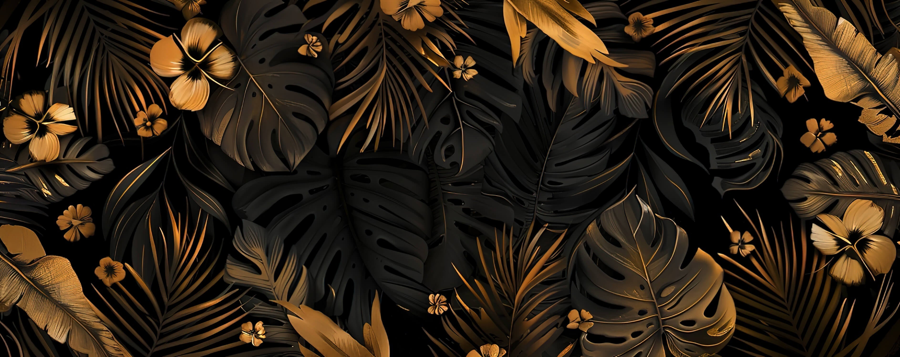 Diese tropische Blättertapete zeigt ein raffiniertes Zusammenspiel von schwarzen und goldenen Monstera-Blättern und schafft eine dramatische und luxuriöse visuelle Aussage. Das tiefschwarze Laub tritt mit skulpturaler Präsenz vor dem dunklen Hintergrund hervor, während goldene Palmwedel und zarte Hibiskusblüten leuchtende Akzente setzen. Die Monstera-Blättertapete erzeugt einen kräftigen, dreidimensionalen Effekt, der jeder Wand Tiefe und Bewegung verleiht.