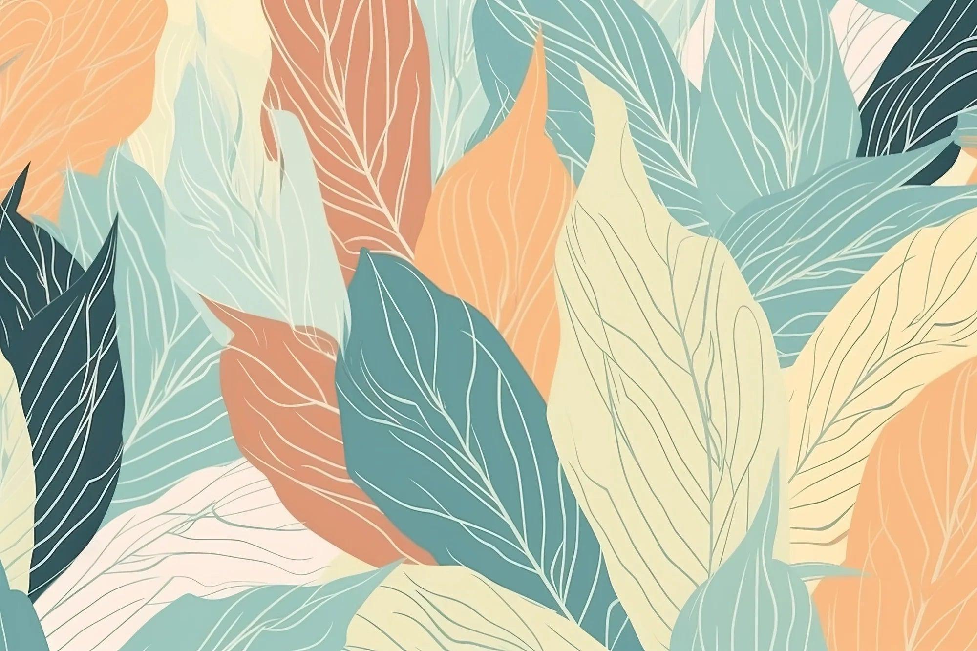 Verwandeln Sie Ihren Raum mit diesem modernen Blätterwandbild, das die Brücke zwischen Natur und abstrakter Kunst schlägt. Die beruhigende Farbkombination und das großformatige Muster schaffen eine Atmosphäre ruhiger Raffinesse und machen es zu einem idealen Hintergrund für Wohn- und Geschäftsräume. Die Vielseitigkeit des Designs ermöglicht es, verschiedene Einrichtungsstile zu ergänzen, von minimalistischem skandinavischem bis hin zu warmem zeitgenössischem Ambiente.