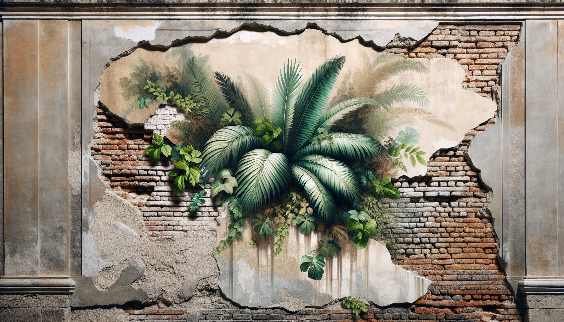 Die realistische Ziegelstruktur und üppige Palmenblätter schaffen eine auffällige Mischung.