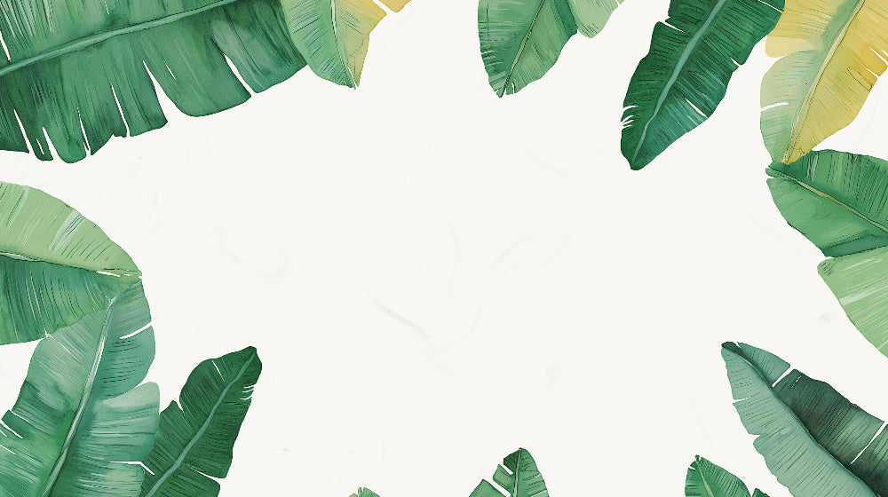 Diese tropische Blättertapete zeigt prächtige Bananenblätter in verschiedenen Schattierungen von Smaragd- und Salbeigrün, kunstvoll arrangiert, um einen natürlichen Rahmen vor einem makellosen weißen Hintergrund zu schaffen. Jede botanische Blätterwand ist mit bemerkenswerten Details dargestellt, die die charakteristischen Adern und natürlichen Texturen der Bananenblätter einfangen. Die Komposition balanciert kräftige, schwungvolle Formen mit elegantem Negativraum und schafft ein anspruchsvolles Zusammenspiel von Natur und Minimalismus.