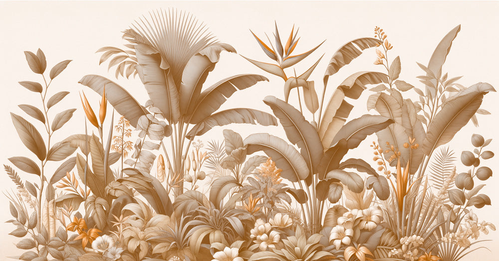 Diese tropische Palmen-Tapete zeigt eine faszinierende Komposition exotischer Flora in eleganten Beige- und Goldtönen. Majestätische Fächerpalmen und Bananenblätter schaffen ein dramatisches Blätterdach, während Paradiesvogelblumen auffällige orangefarbene Akzente im gesamten Design setzen. Die exotische botanische Tapete verfügt über sorgfältig detaillierte Blätter und Stängel, die durch feine Linienführung und subtile Schattierungen ein Gefühl von Tiefe und Dimension erzeugen.