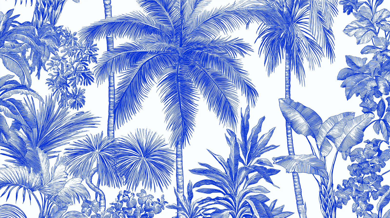 Diese tropische Palmen-Tapete zeigt eine auffällige botanische Komposition in lebendigem Kobaltblau vor einem klaren weißen Hintergrund. Die detaillierte Linienführung fängt die majestätische Bewegung der Palmenwedel ein, ergänzt durch exotische Bananenblätter und tropische Blumen. Jedes Element ist sorgfältig in einer raffinierten monochromen Farbpalette illustriert, wodurch eine harmonische Verbindung der dramatischsten Formen der Natur mit künstlerischer, fast architektonischer Präzision entsteht.