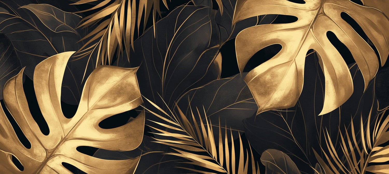 Tropische Tapete | Goldene Monstera- und Palmblätter
