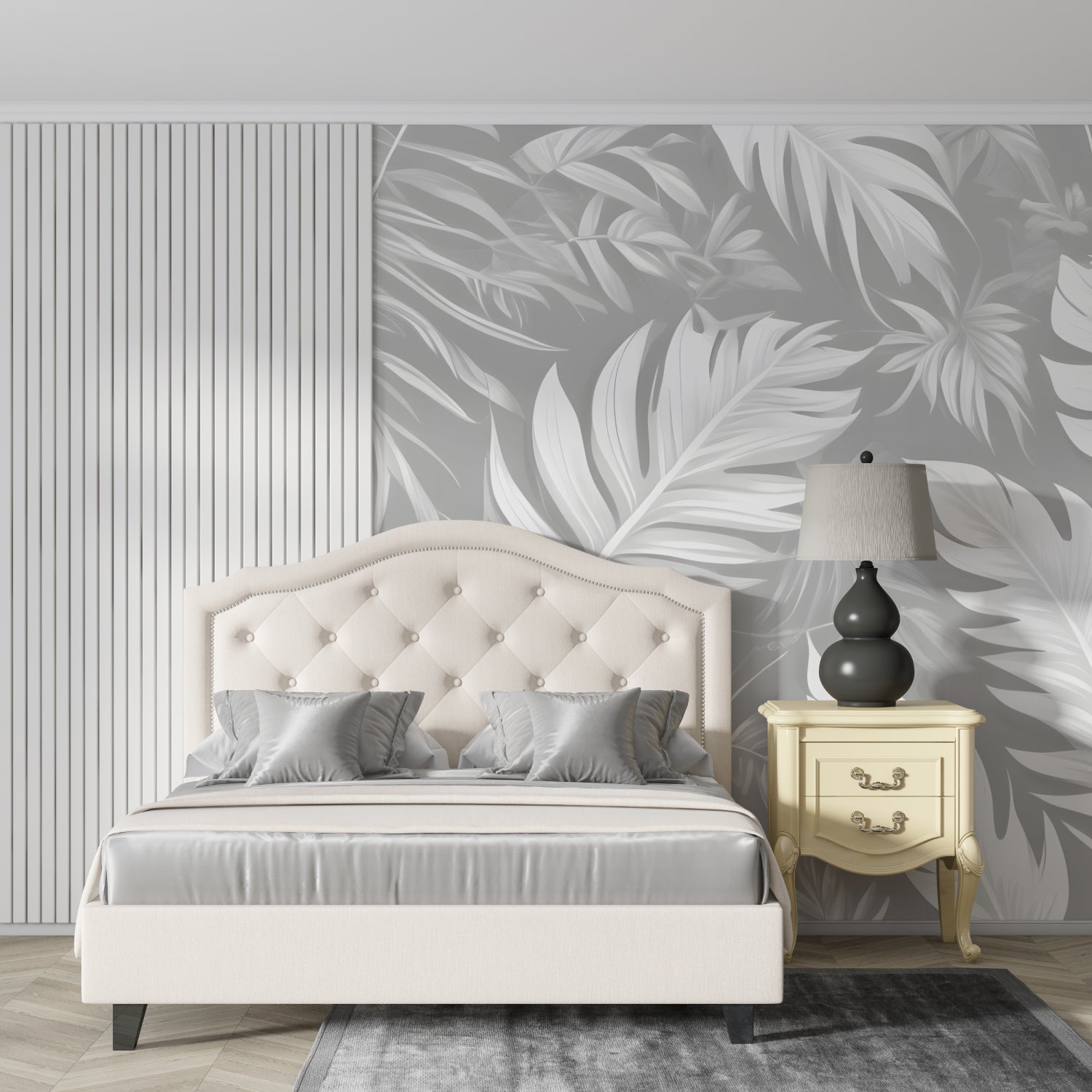 Verwandeln Sie jeden Innenraum mit dieser grauen botanischen Tapete, die die Lücke zwischen Natur und zeitgenössischem Design überbrückt. Das moderne tropische Wandbild harmoniert sowohl mit minimalistischen als auch klassischen Einrichtungskonzepten und ist somit eine vielseitige Wahl für Hauptschlafzimmer, Wohnräume oder Heimbüros. Die monochrome Farbpalette sorgt für eine raffinierte Atmosphäre, während die botanischen Motive Ihrem Raum ein Gefühl natürlicher Ruhe verleihen.