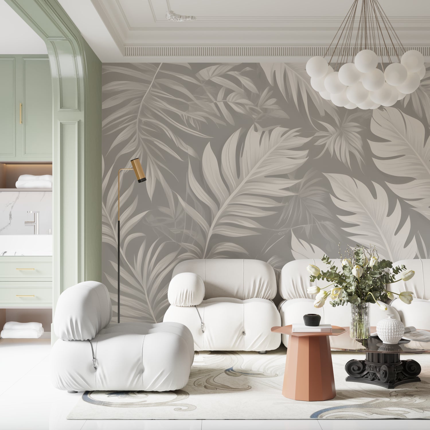 Diese tropische Blättertapete zeigt eine elegante Anordnung großformatiger Palmwedel, die in anspruchsvollen Weißtönen vor einem ruhigen grauen Hintergrund dargestellt sind. Das anmutige, fließende Design verfügt über fachmännisch detaillierte Palmenblattmuster, die ein Gefühl sanfter Bewegung und organischen Rhythmus erzeugen. Jeder sorgfältig gestaltete Wedel scheint schwerelos zu schweben und wirft subtile Schatten, die der Gesamtkomposition bemerkenswerte Tiefe verleihen.