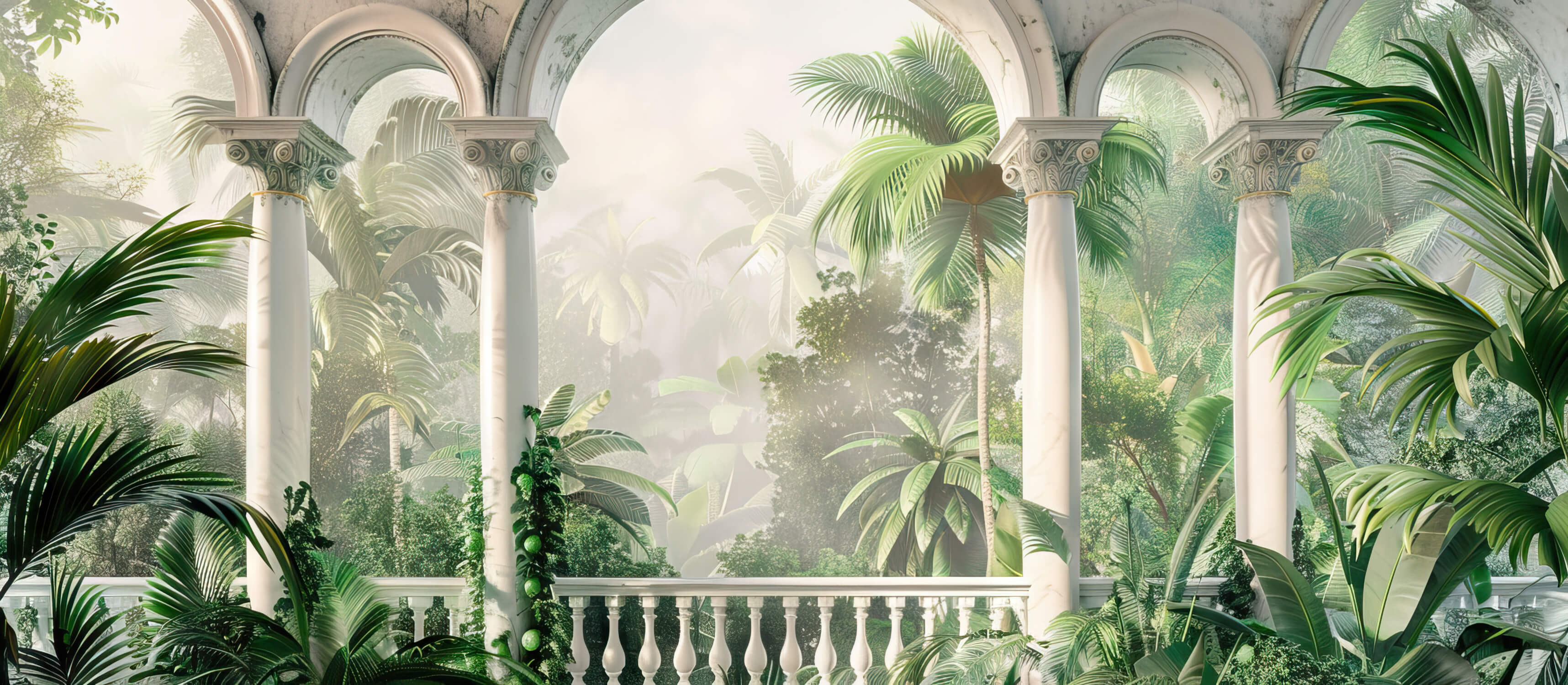 Diese tropische Bogen-Tapete schafft ein atemberaubendes Portal in ein ruhiges Paradies, wo klassische Architektur auf üppige Vegetation trifft. Elegante korinthische Säulen rahmen eine neblige tropische Aussicht, während lebendige Palmwedel und üppiges Laub Schichten von Tiefe gegen einen sanften, ätherischen Hintergrund schaffen. Die architektonische Palmen-Tapete verbindet meisterhaft raffinierte Strukturelemente mit natürlicher Schönheit und erzeugt einen anspruchsvollen Trompe-l’œil-Effekt.