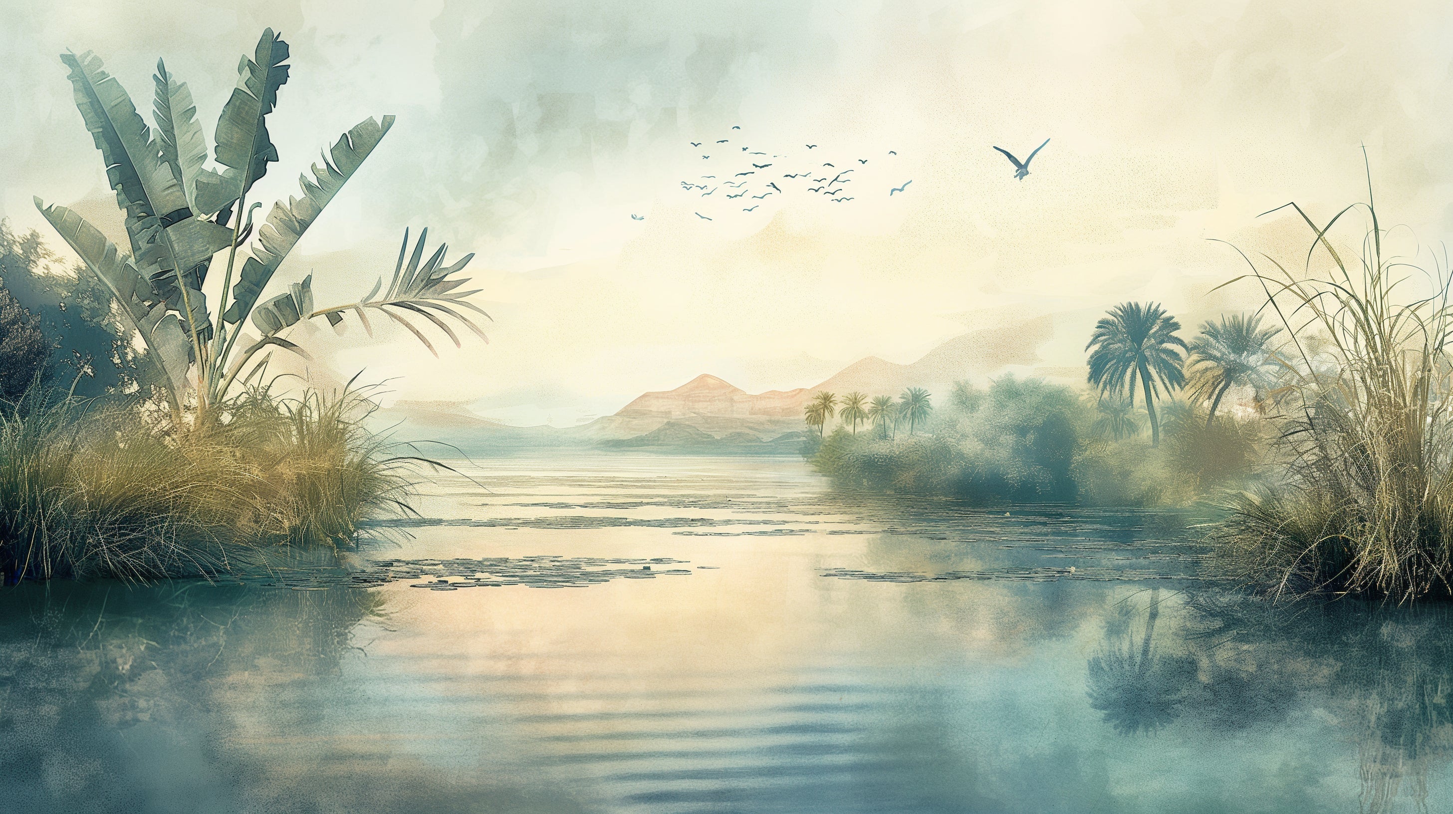 Diese tropische Landschaftstapete fängt die ätherische Schönheit einer ruhigen Oase bei Sonnenaufgang ein. Majestätische Bananenblätter und Palmenwedel rahmen eine mystische Wasserlandschaft, in der sanfte Wellen das weich getönte Himmelsbild spiegeln. Die Komposition verbindet gedämpfte Salbeigrüntöne mit golden-beigen Nuancen, während ferne Berge und hochfliegende Vögel Schichten von Tiefe in diesem exotischen Naturwandbild schaffen. Die aquarellähnliche Technik verleiht eine künstlerische Weichheit, die die verträumte Atmosphäre verstärkt.