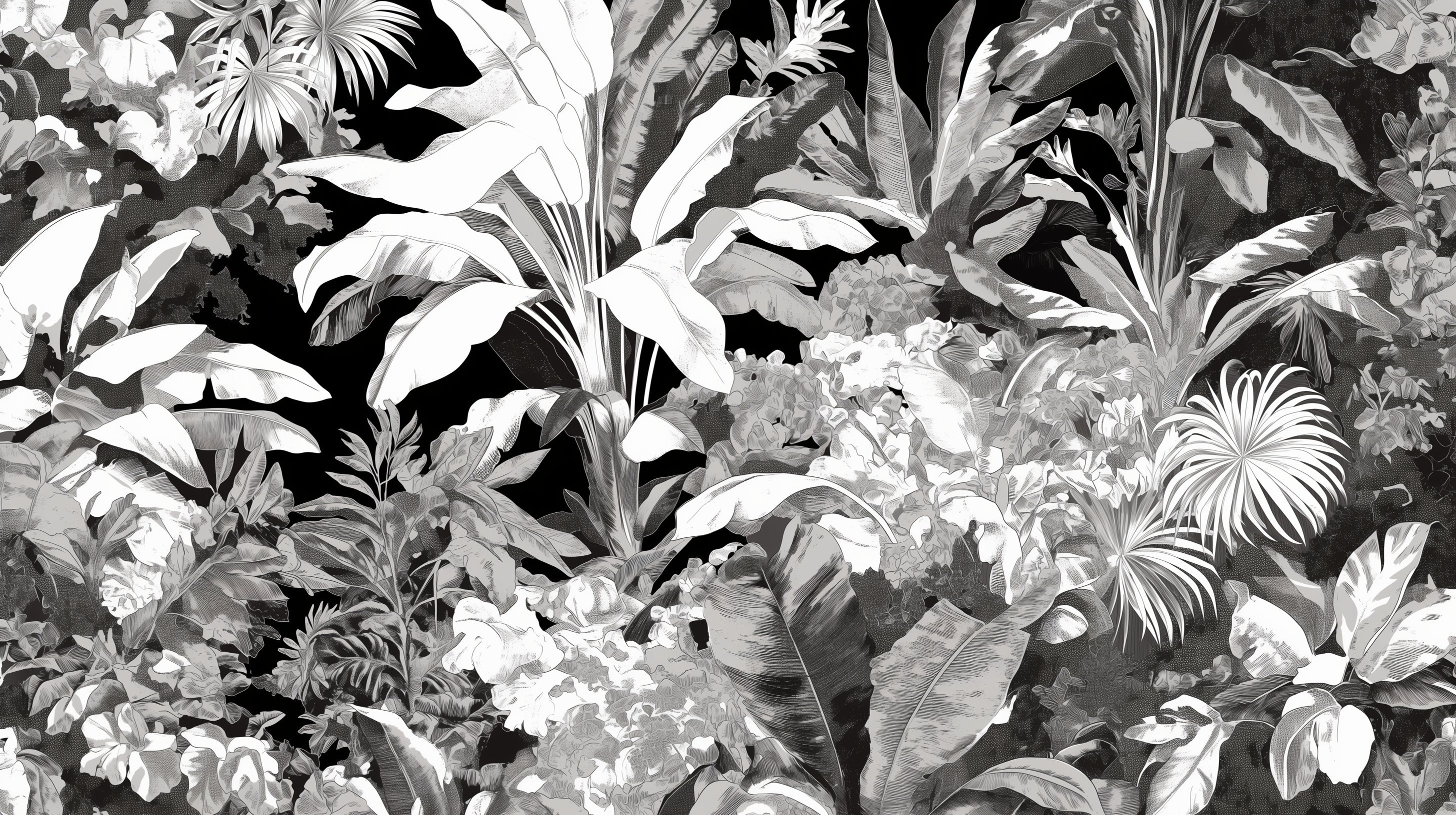 Diese tropische botanische Tapete präsentiert eine atemberaubende monochromatische Komposition, in der sich die Pracht der Natur in dramatischem Schwarzweiß entfaltet. Majestätische Palmenwedel und Bananenblätter schaffen kräftige Silhouetten vor dem tiefschwarzen Hintergrund, während detaillierte Monstera-Blätter und exotisches Laub in verschiedenen Grautönen erscheinen. Die schwarz-weiße Dschungeltapete zeigt ein künstlerisches Spiel von Licht und Schatten und fängt die filigranen Texturen und vielschichtigen Tiefen eines üppigen tropischen Paradieses ein.