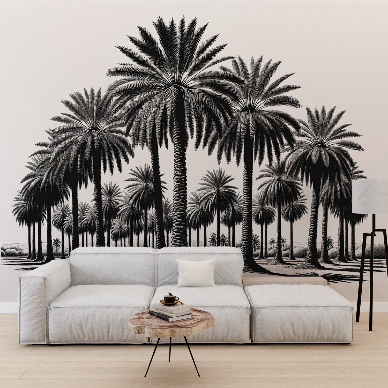 Dieses schwarz-weiße Palmen-Mural verleiht Ihren Wänden echten Charakter.