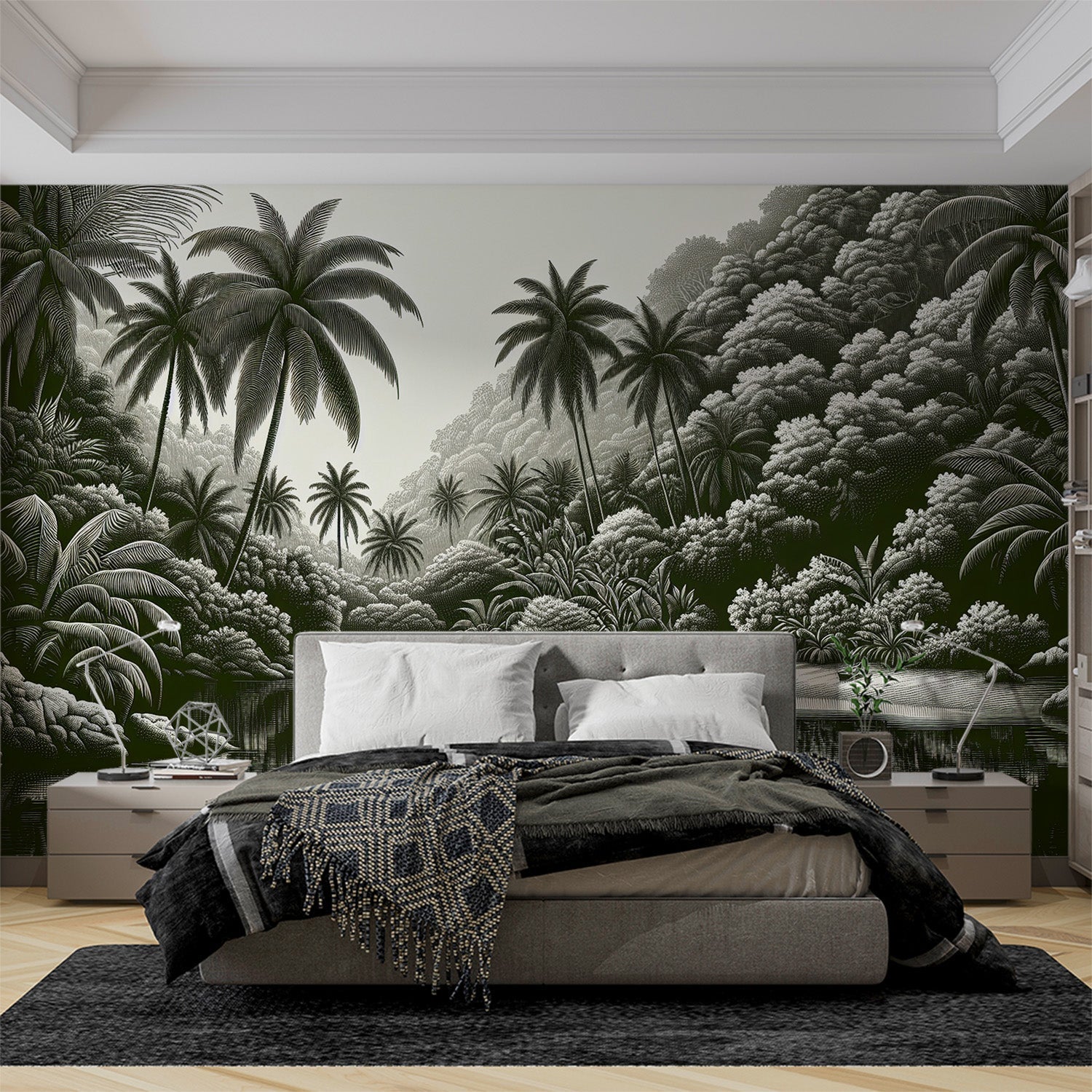 Verwandeln Sie Ihren Raum in ein exotisches Refugium mit dieser Palmen-Tapete. Das dramatische, aber dennoch raffinierte monochrome tropische Wandbild bringt ein Gefühl von Ruhe und Eleganz in jeden Raum und schafft eine immersive Umgebung, die die Lücke zwischen künstlerischem Ausdruck und natürlicher Schönheit überbrückt. Die ausgewogene Komposition bietet eine zeitlose Anziehungskraft, die harmonisch mit verschiedenen Einrichtungsstilen harmoniert, von modern-minimalistisch bis klassisch-elegant.