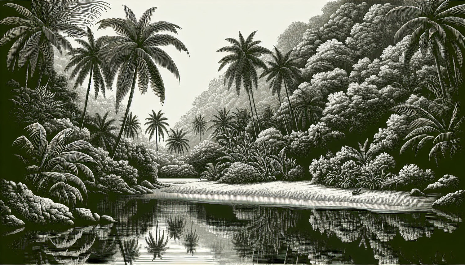 Diese tropische Dschungel-Tapete zeigt eine faszinierende monochrome Landschaft, in der hoch aufragende Palmen ihre Spiegelungen auf ruhigem Wasser werfen. Die filigranen Details der schwarz-weißen Naturtapete offenbaren ein reichhaltiges Geflecht tropischer Pflanzen, von zarten Palmwedeln bis zu dichtem Waldvegetation, alles in eleganten Grautönen dargestellt, die durch meisterhafte Schattierung Tiefe und Dimension schaffen.