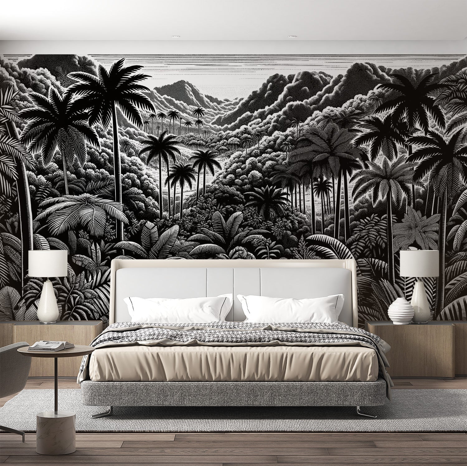 Diese tropische Waldtapete zeigt eine meisterhaft detaillierte Schwarz-Weiß-Landschaft, in der majestätische Palmen vor dramatischen Berggipfeln emporragen. Die filigrane Linienführung fängt jedes Detail der exotischen Dschungelszene ein, von den geschichteten Palmwedeln im Vordergrund bis zu den nebligen Bergen im Hintergrund. Die monochrome Farbpalette verleiht der Komposition eine raffinierte Tiefe, wobei präzises Schraffieren reiche Texturen über das dichte tropische Laubwerk schafft.