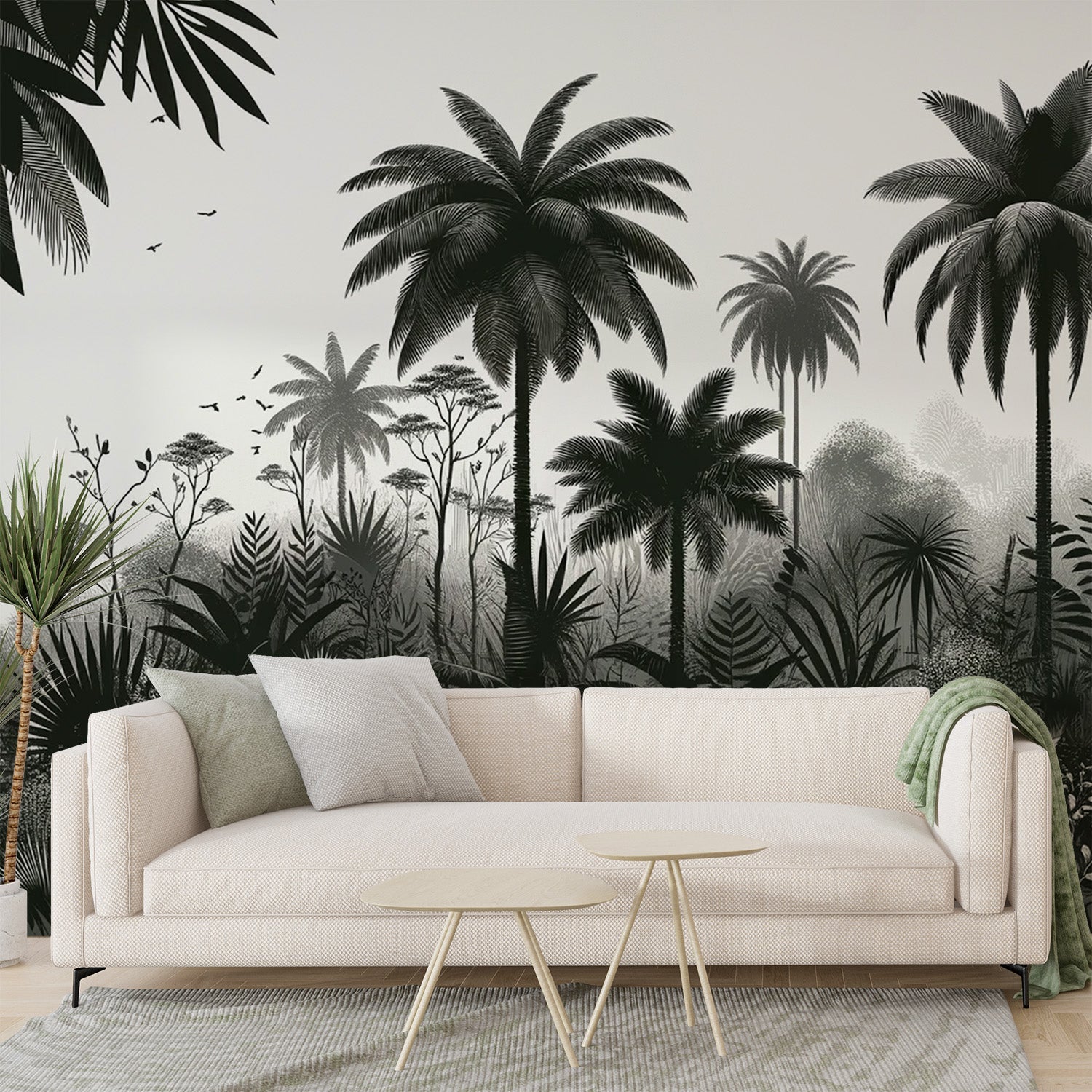 Diese tropische Waldtapete schafft ein eindrucksvolles monochromatisches Panorama, das die majestätische Schönheit eines exotischen Paradieses einfängt. Hohe Palmen stehen wie Wächter vor einem nebligen Hintergrund, während detailliertes tropisches Laub in Schichten aus sattem Schwarz und subtilen Grauverläufen entfaltet wird. Vögel schweben anmutig durch die Komposition und verleihen diesem schwarz-weißen Dschungelwandbild Bewegung und Leben, das meisterhaft dramatische Silhouetten mit zarten botanischen Details ausbalanciert.