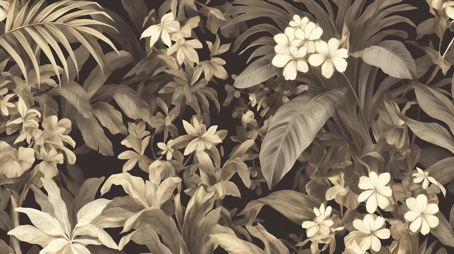Diese tropische Blumen-Tapete präsentiert eine elegante Verschmelzung exotischer Botanicals, dargestellt in raffinierten Sepiatönen. Vor einem tiefen Schokoladenhintergrund schaffen anmutige Palmwedel und zarte Blüten eine geschichtete Komposition mit beeindruckender Tiefe. Die tropische Palmen-Tapete zeigt sorgfältig detaillierte Blätter und Blütenblätter in warmen Beige- und Cremetönen, die eine dramatische, aber dennoch raffinierte botanische Erzählung schaffen, die Aufmerksamkeit erregt und gleichzeitig zurückhaltende Eleganz bewahrt.