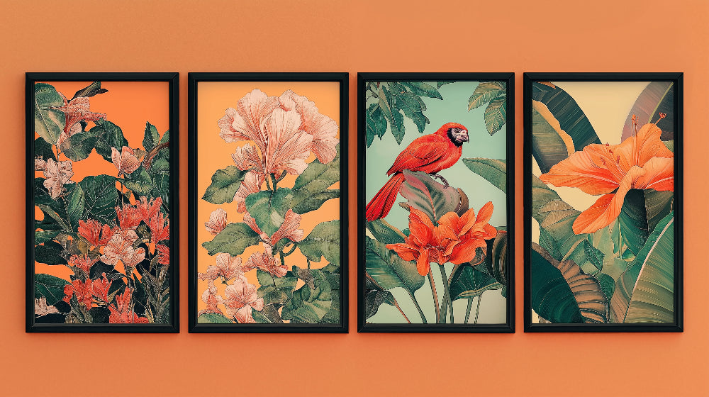 Diese tropische Vogel-Tapete zeigt eine elegante Verschmelzung von botanischer Kunst und exotischer Tierwelt. Lebendige korallenpfirsichfarbene Hibiskusblüten und üppige grüne Bananenblätter schaffen einen harmonischen Hintergrund für ein auffälliges rotes Papageien-Tapetendesign. Die Komposition entfaltet sich über mehrere Paneele, von denen jedes sorgfältig gestaltet ist, um das Zusammenspiel zwischen zarten floralen Elementen und kräftigem tropischem Laub vor kontrastierenden orange- und minzgrünen Hintergründen darzustellen.