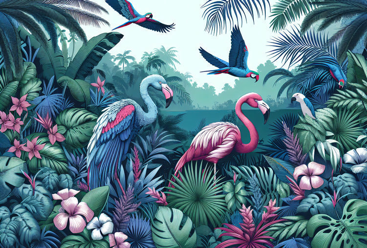 Diese tropische Vogel-Tapete schafft ein bezauberndes Tor zu einem lebendigen Paradies, in dem rosa Flamingos und blaue Aras vor einem Hintergrund aus üppigem Grün im Mittelpunkt stehen. Das Design balanciert meisterhaft tiefe smaragdgrüne Palmenwedel und Monstera-Blätter mit zarten rosa Plumeria-Blüten, während die exotische Vogel-Tapete anmutige Flamingos in verschiedenen Posen zeigt, deren Federn in atemberaubenden blau-grauen und korallenrosa Farbtönen dargestellt sind.