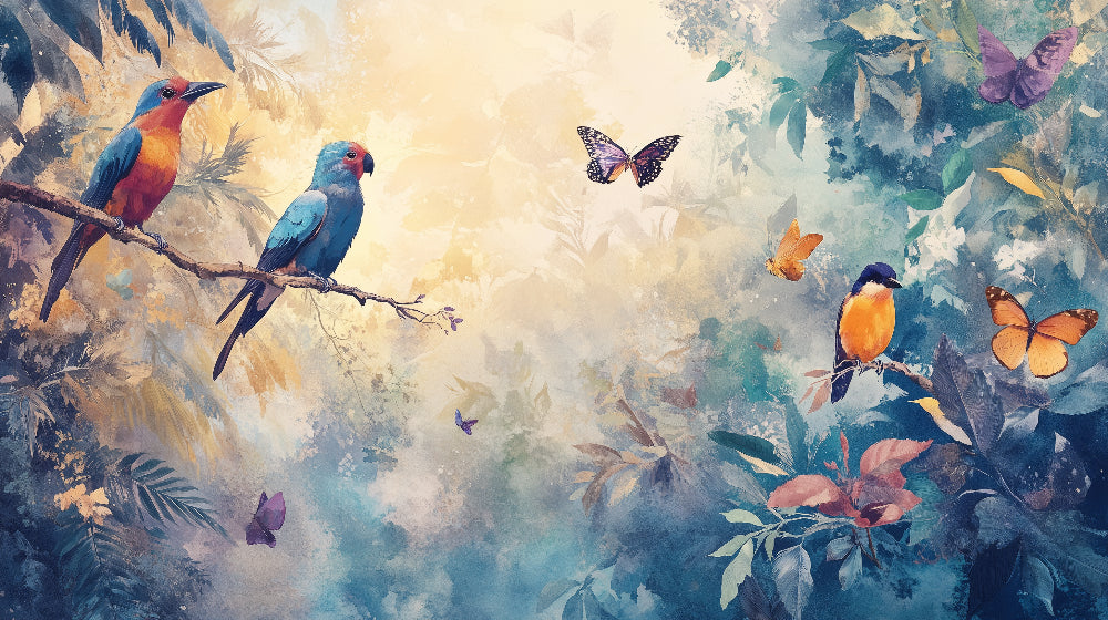 Diese Tropenvogel-Tapete fängt eine bezaubernde Szene ein, in der exotische Papageien anmutig auf zarten Zweigen vor einem verträumten Hintergrund sitzen. Die lebendige Komposition zeigt türkis-blaue und orange-rote Vögel in atemberaubendem Detail, während zarte Schmetterlings-Wandbild-Elemente durch die neblige Atmosphäre tanzen. Die künstlerische Mischung aus warmen goldenen Tönen und kühlen Blautönen erzeugt einen raffinierten Farbverlauf, ergänzt durch subtile tropische Pflanzen-Silhouetten.