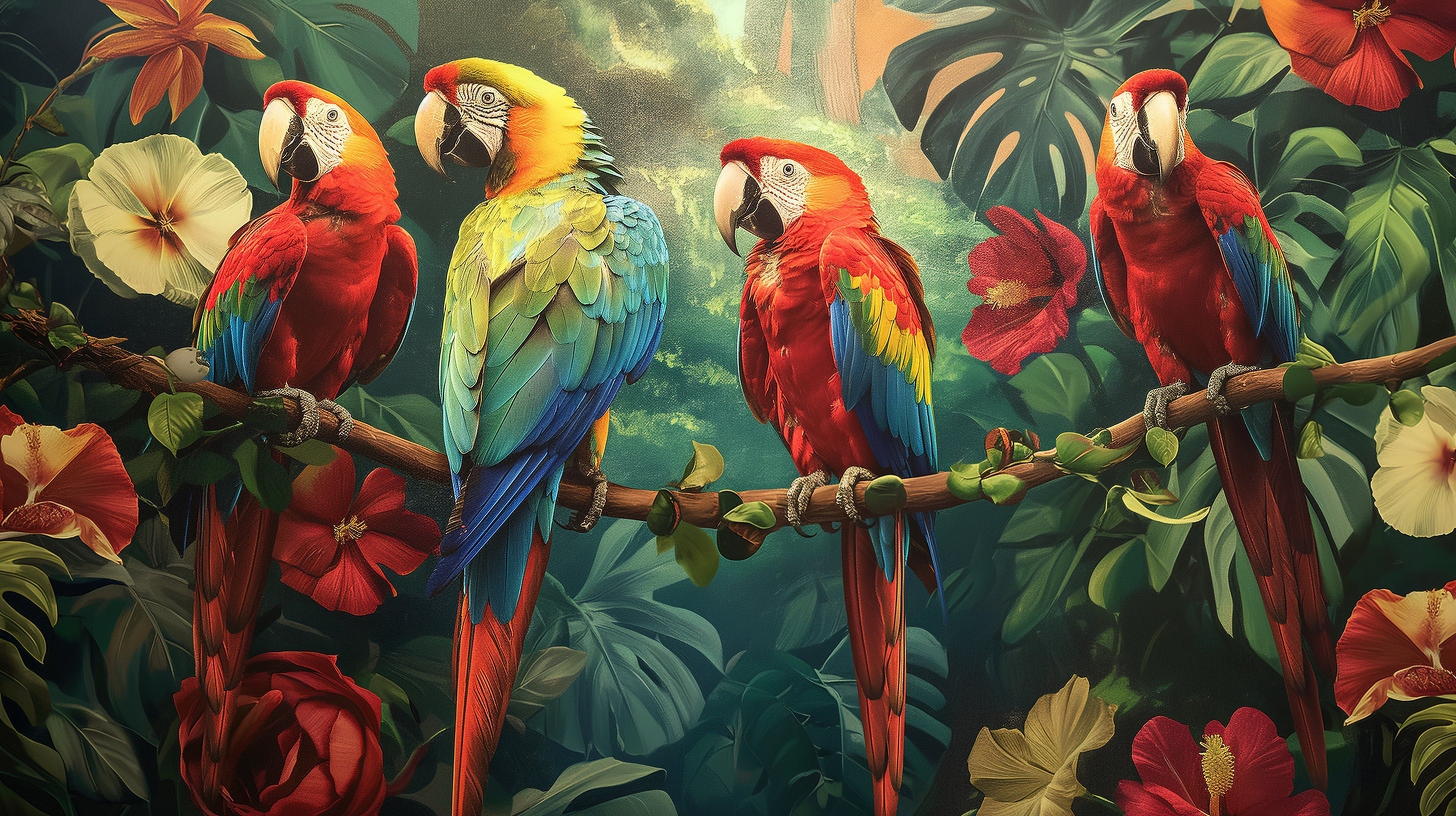 Tropische Vögel Tapete | Aras mit exotischen Blumen