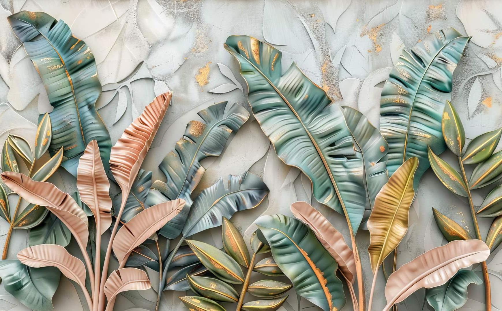 Diese tropische Blättertapete zeigt eine atemberaubende Sammlung dreidimensionaler Bananenblätter in raffinierten Salbeigrün- und Korallenrosa-Tönen, veredelt mit zarten Blattgoldakzenten. Die meisterhaft gestaltete 3D botanische Tapete erzeugt einen eindringlichen Tiefeneffekt vor einem sanften grauen Hintergrund, während die kunstvolle Anordnung unterschiedlicher Blattgrößen und -texturen der Komposition dynamisches visuelles Interesse verleiht.