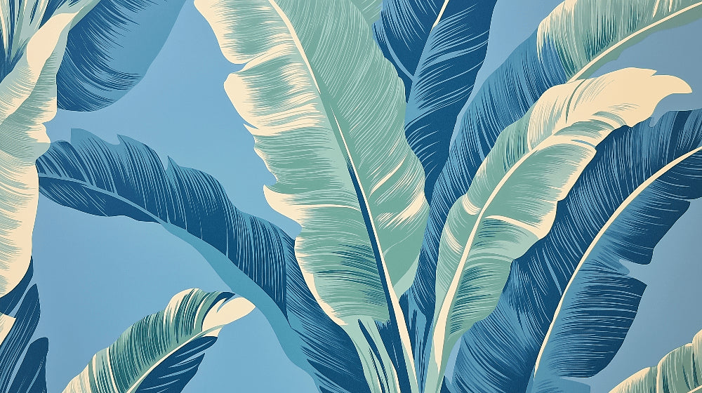 Diese tropische Blättertapete zeigt eine künstlerische Interpretation prächtiger Bananenblätter, dargestellt in einer raffinierten Palette aus Marineblau und Minzgrün vor einem ruhigen himmelblauen Hintergrund. Das übergroße botanische Tapetendesign verfügt über sorgfältig detaillierte Wedel mit anmutigen Adern und organischen Texturen, die eine kühne und dennoch harmonische Komposition schaffen, die Aufmerksamkeit erregt und gleichzeitig visuelles Gleichgewicht bewahrt.